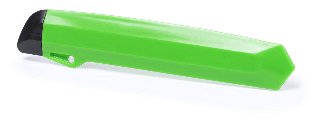 Cutter con cuchilla ancha y mango ergonómico troquelado. Capucha extraíble para ajuste de corte de cuchilla.