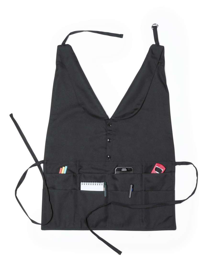 Elegante delantal con adorno de botones en material 100% poliéster. Con cinta para cuello ajustable y cintas para cintura.