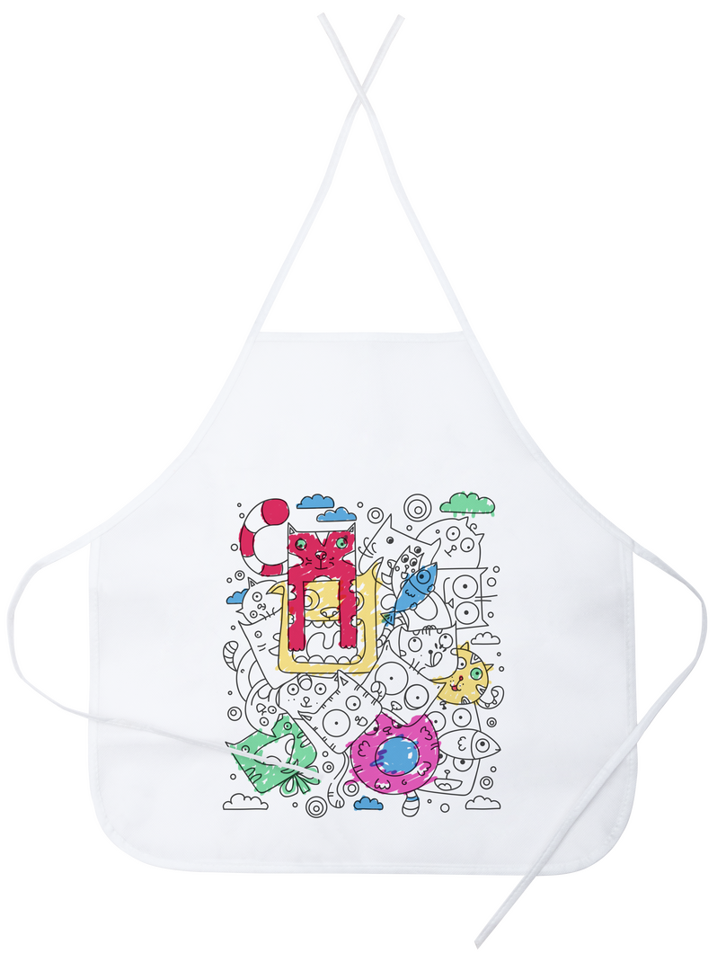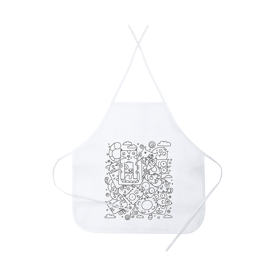 Delantal de non-woven en color blanco especialmente diseñado para colorear con rotuladores. Incluye 5 rotuladores de cuerpo cilíndrico en variados colores. Con cintas de ajuste en cuello y cintura. Talla Única. Niño. 5 Rotuladores Incluidos