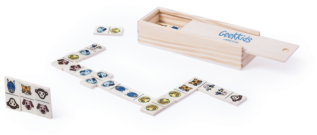 Divertido dominó de animalitos en madera. Con 28 piezas de madera y presentado en estuche de madera con tapa. 28 Piezas