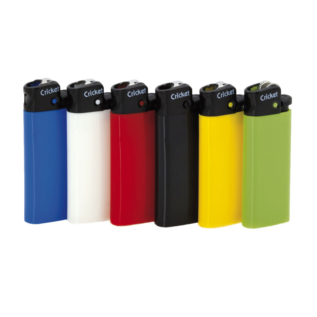 Miniencendedor Cricket a gas, de mecanismo de piedra en variada gama de vivos colores. Con protección infantil.
