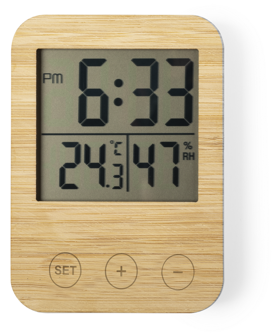 Estación meteorológica de línea nature con frontal en bambú. Funciones higrómetro y termómetro. Alimentación a pilas (2xAAA no incluidas) y presentado en atractiva caja de diseño eco. 2 Pilas AAA No Incluidas