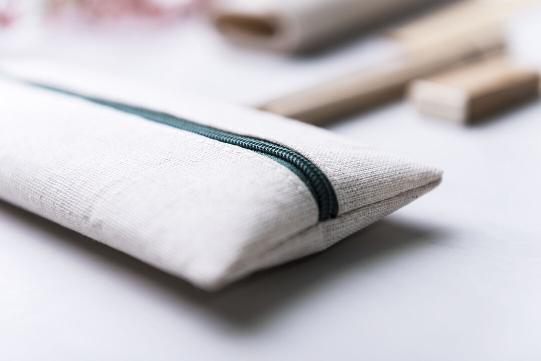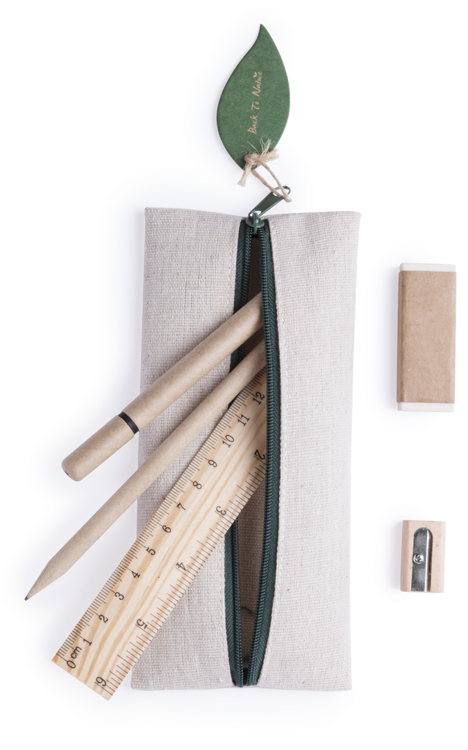 Práctico estuche de línea nature. De tamaño compacto en combinación de materiales yute y algodón. Con cierre de cremallera y hojita para publicidad en tirador. 5 Piezas