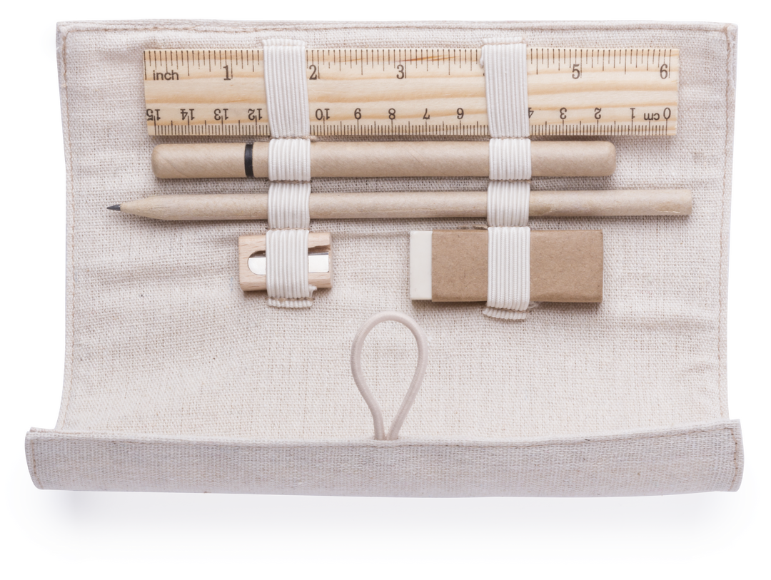 Original estuche de línea nature. Fabricado en yute y algodón, con elegante cierre de botón. Contiene 5 piezas de acabado nature: Goma de borrar, sacapuntas y bolígrafo de cartón reciclado, con lápiz y regla de madera. 5 Piezas