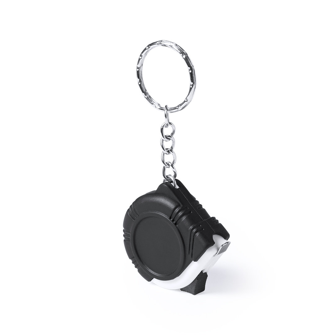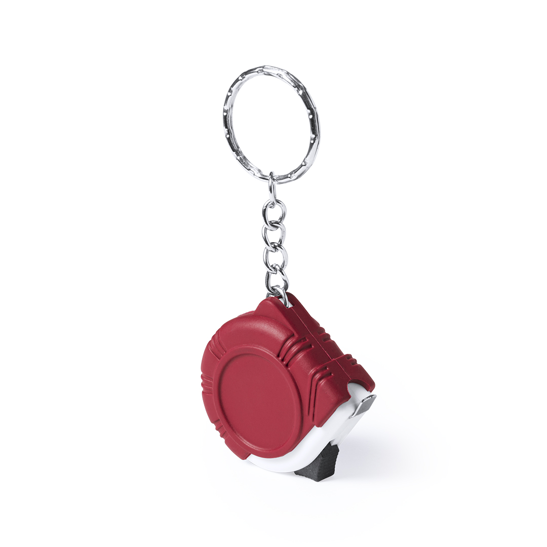 Flexómetro llavero de 1 metro con cuchilla metálica y mecanismo de bloqueo. Medidas en centímetros, pulgadas y pies. Con troquelado especial para marcaje.