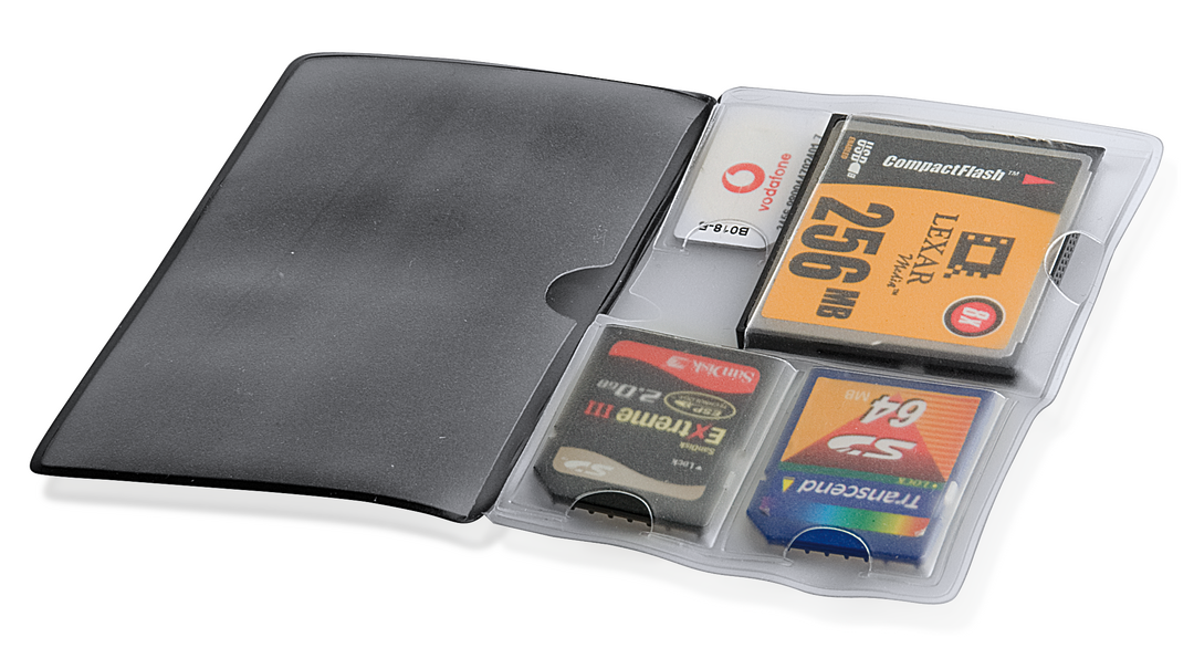 Original funda en resistente PVC para tarjetas de memoria. Con ranuras MMC, CF, SD y SIM. Tarjetas: MMC, CF, SD, SIM