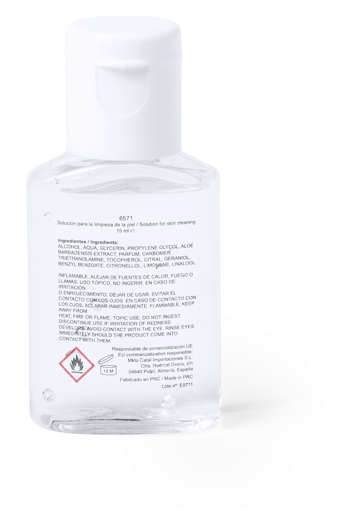 Gel hidroalcohólico para higiene y limpieza de la piel en bote rellenable de 15 ml, con dosificador y tapón de seguridad. Cuerpo transparente, con tapón en color blanco. Solución con 65% de contenido de alcohol. Artículo con certificación GMP (Good Manufa 15 ml. Solución para la limpieza de la piel