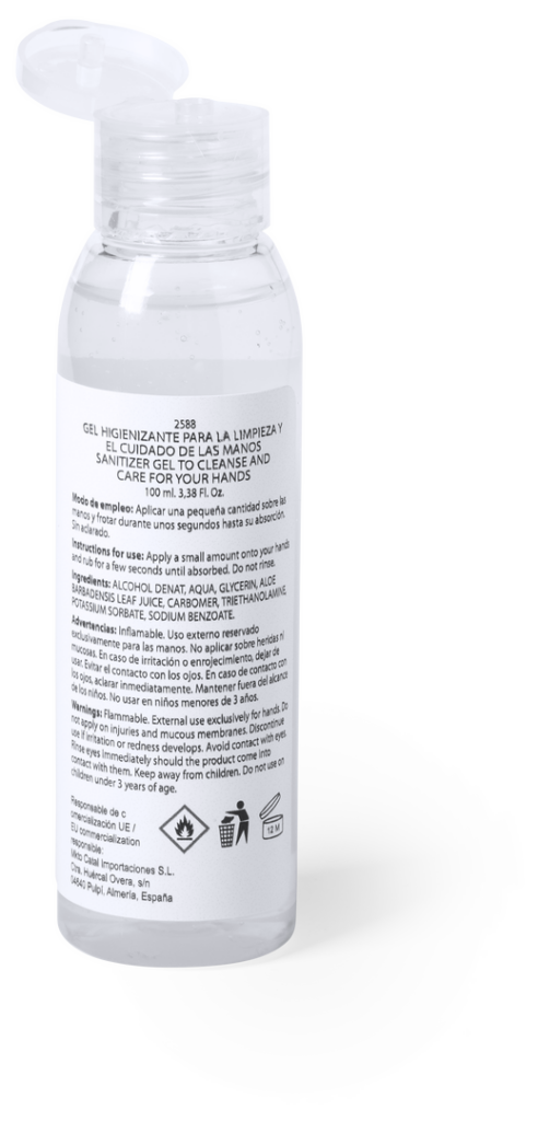 Gel hidroalcohólico para higiene y limpieza de la piel, con extracto balsámico de Aloe Vera. Presentado en bote rellenable de 100 ml, con dosificador y tapón de seguridad. Cuerpo transparente, con tapón a juego y etiqueta blanca laminada con amplia superf 100 ml. Solución para la limpieza de la piel