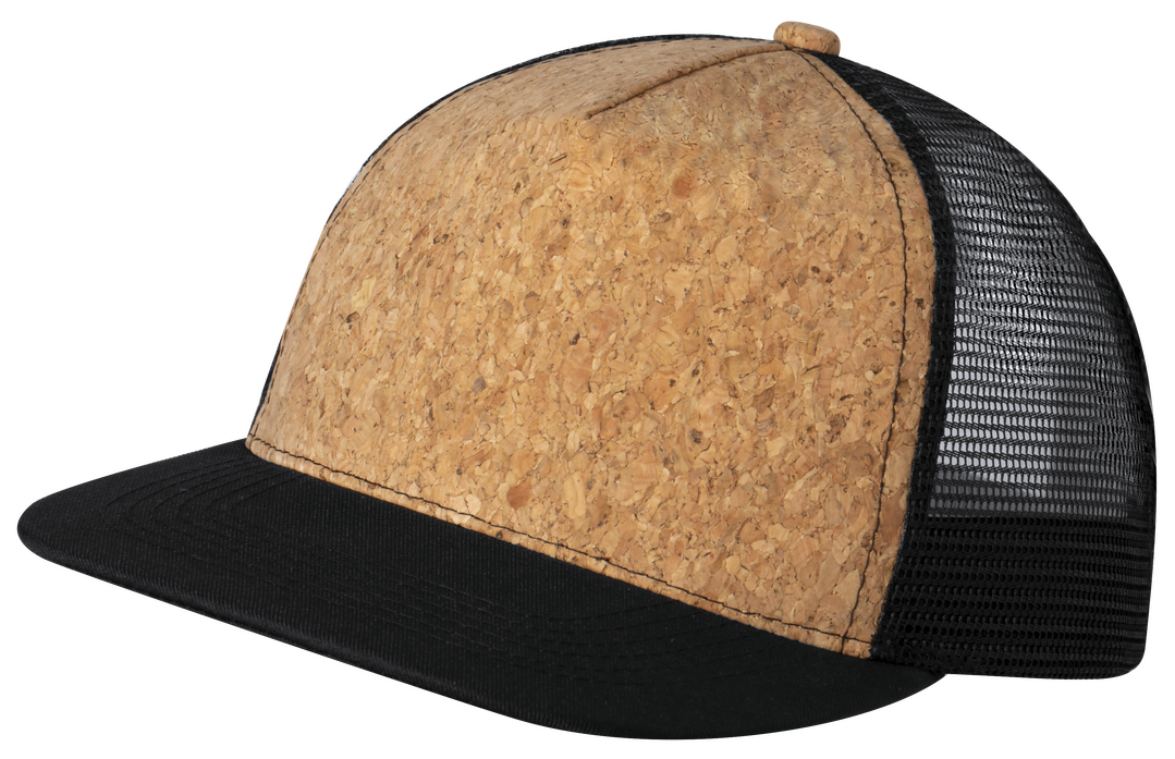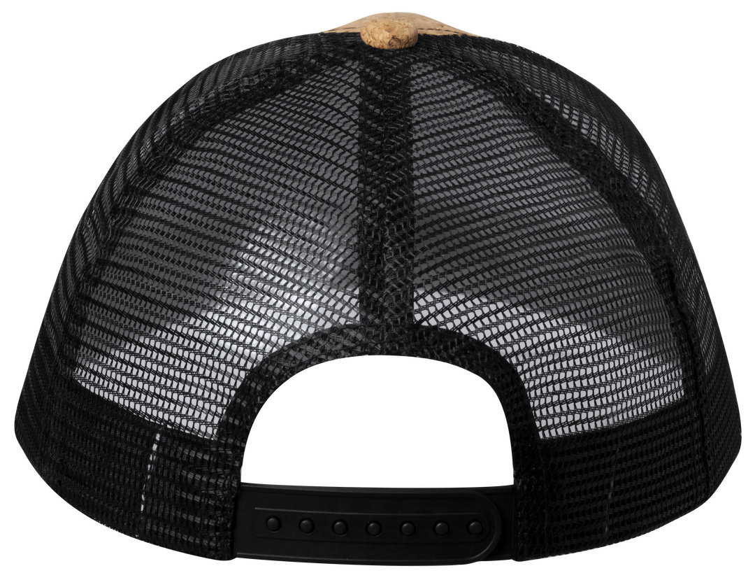 Gorra de línea nature. 5 paneles en combinación de corcho natural con tela de rejilla. Con cierre ajustable de plástico. 5 Paneles
