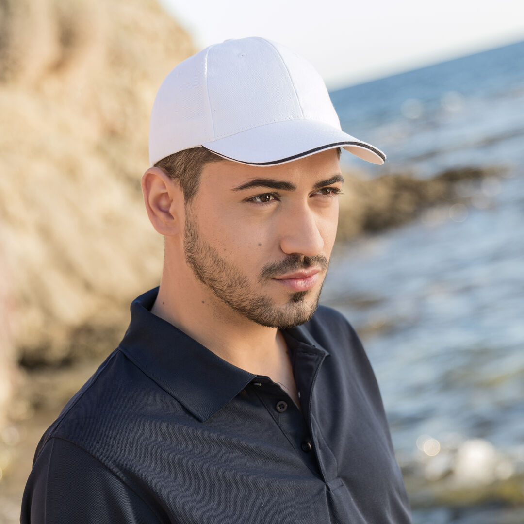 Gorra de 6 paneles en material 100% algodón peinado. En variada gama de vivos colores, con sandwich en color y acolchado en visera. Orificios de ventilación bordados y cierre ajustable de velcro. 6 Paneles