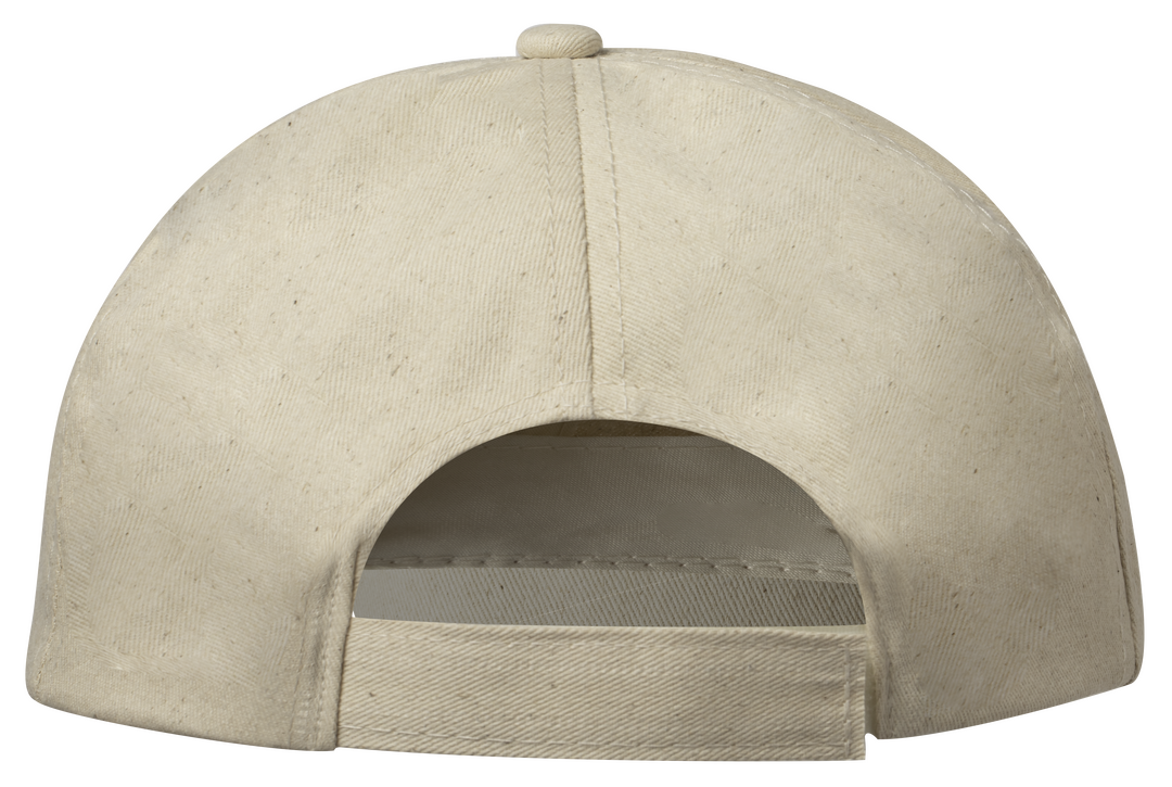 Gorra de línea nature. 5 paneles en algodón orgánico de suave acabado crudo. Con cierre ajustable de velcro y orificios de ventilación bordados, con distintivo en etiqueta. 5 Paneles