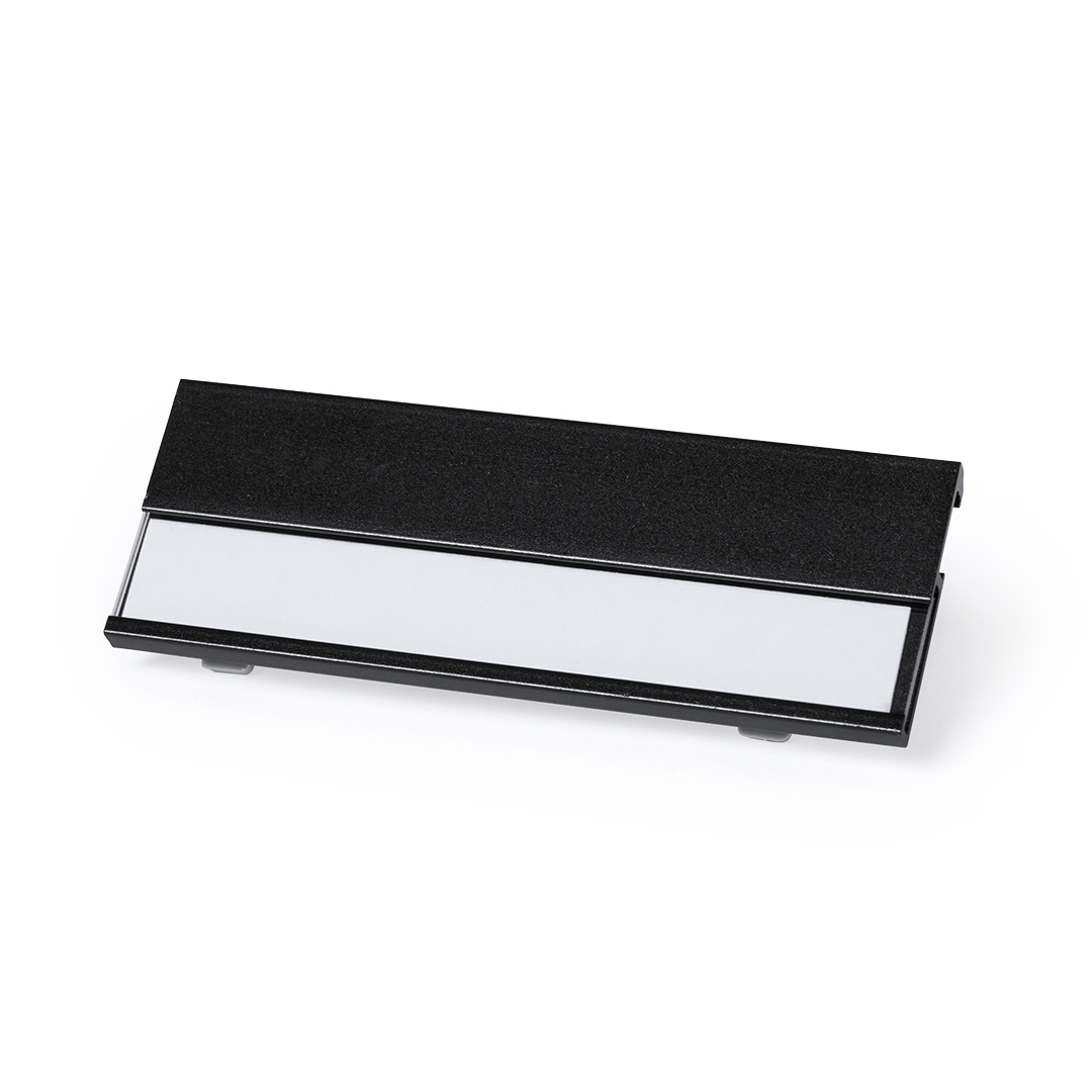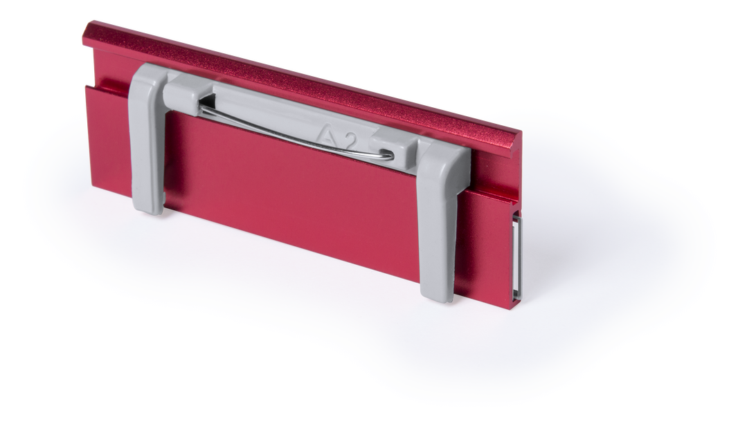 Identificador de aluminio en vivos colores y pinza trasera de enganche para una fijación segura.