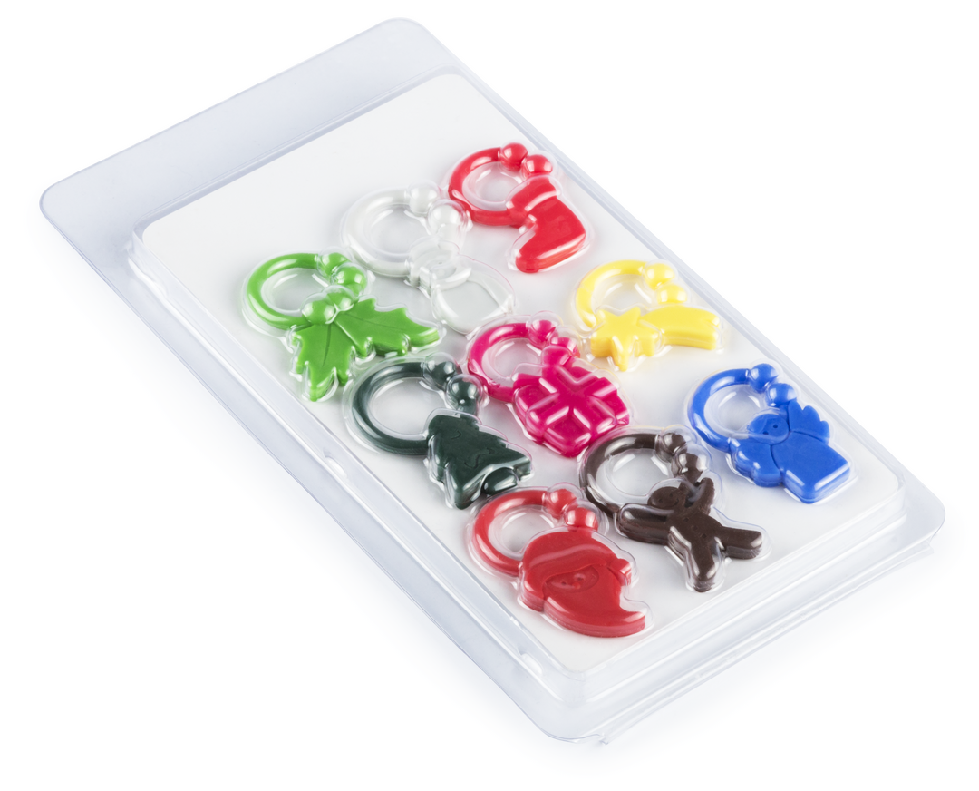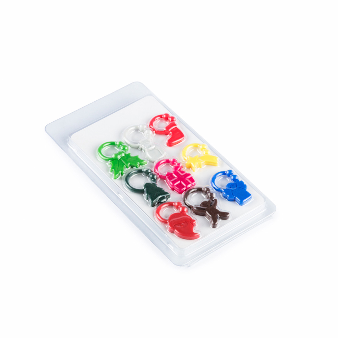 Identificador de copas de silicona en 9 diseños de navidad de vivos colores. Presentado en estuche con compartimentos individuales. Presentado en atractivo bistre de diseño en PVC transparente. 9 Piezas