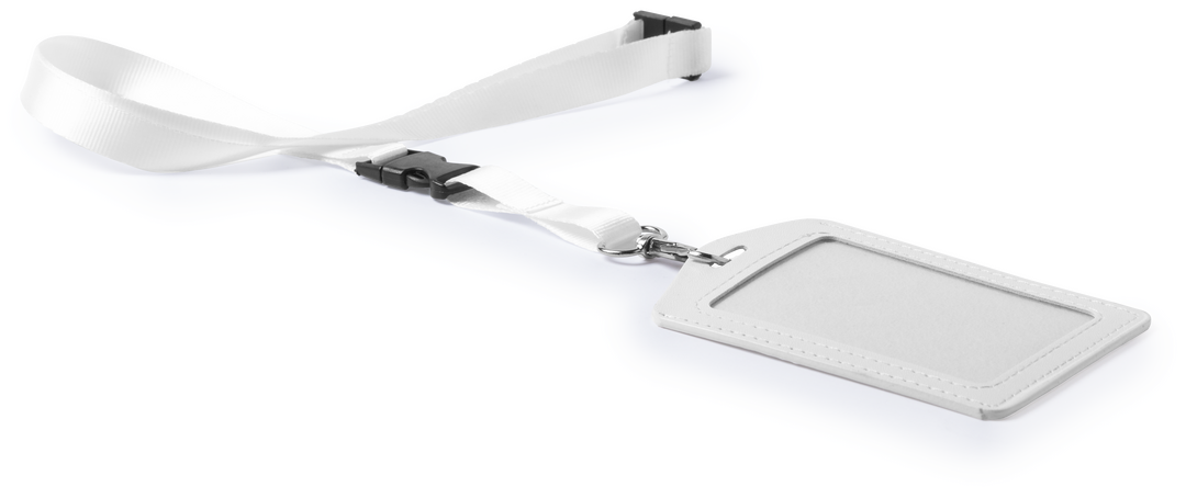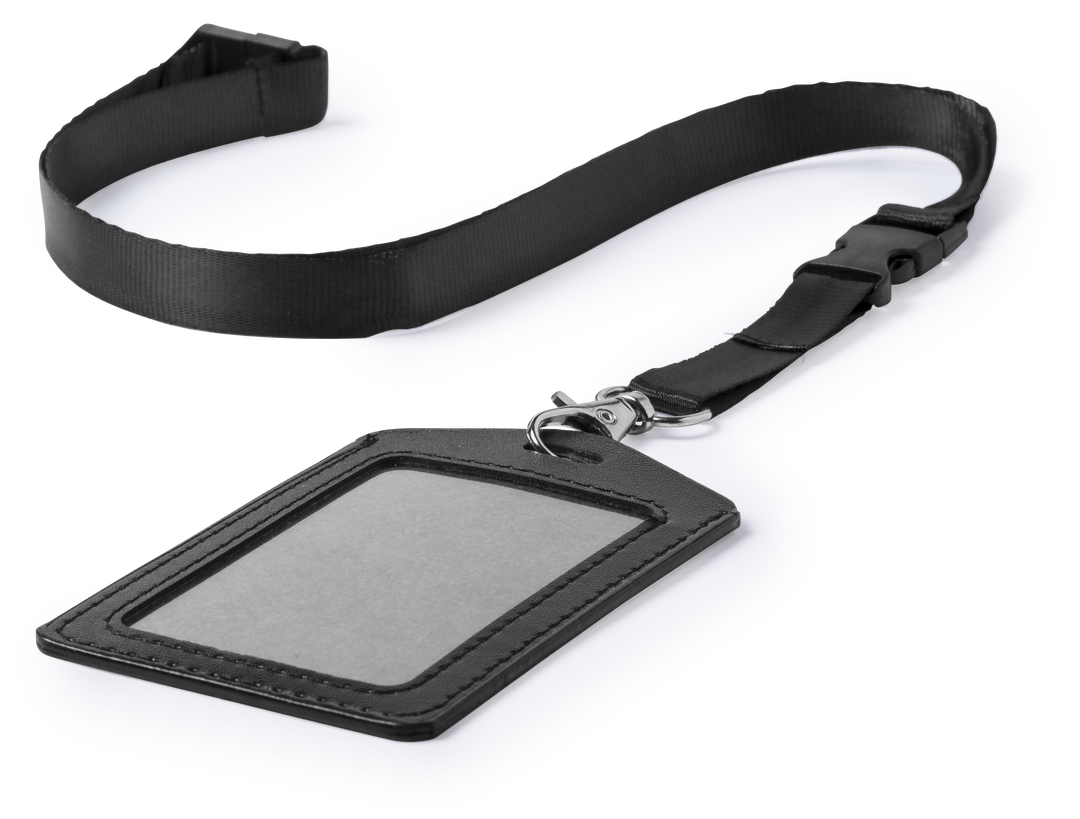 Lanyard con identificador a juego. Lanyard en resistente poliéster, con accesorio de seguridad en el cuello y cierre buckle para fácil manejo de la identificación, con mosquetón de ajuste. Identificador en polipiel, con ventana de PVC y ranura para tarjet Cierre Seguridad