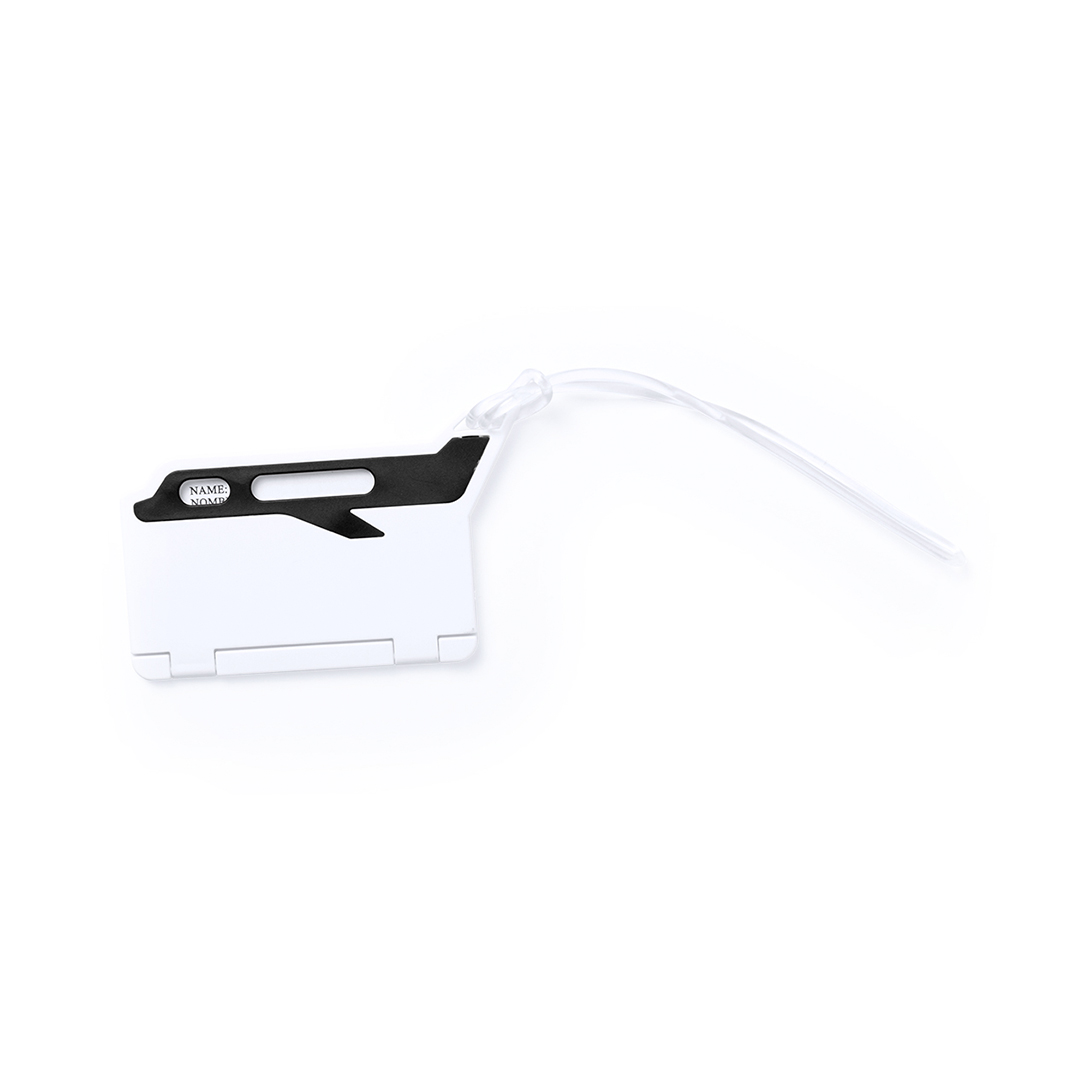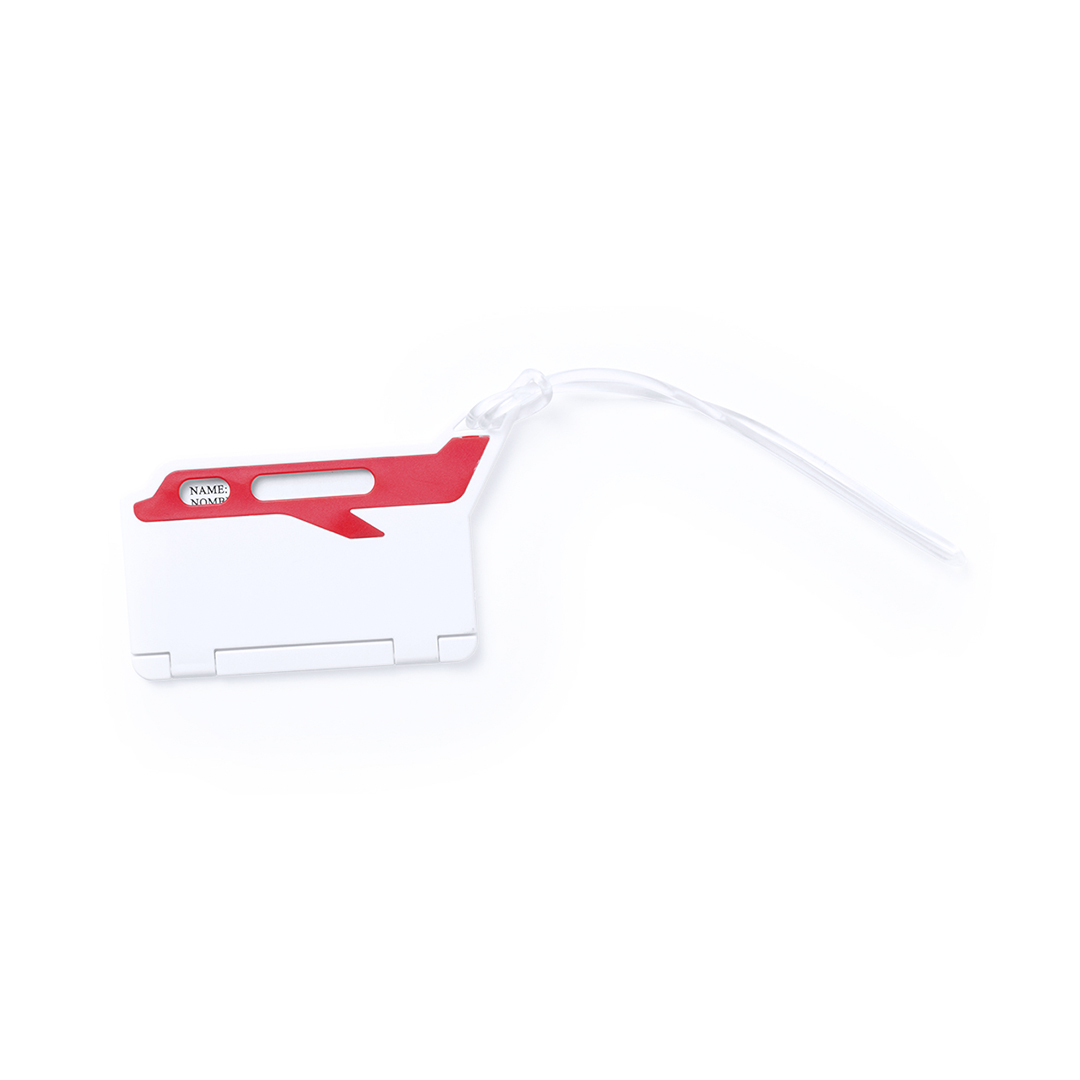Original identificador de maletas de diseño de avión en resistente material de combinación bicolor. Con resistente cinta de acople y tarjeta de identificación en castellano e inglés.