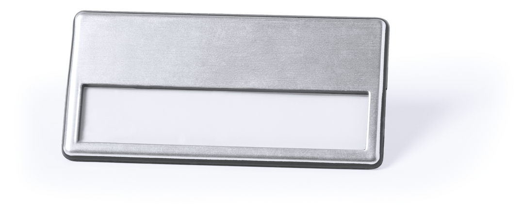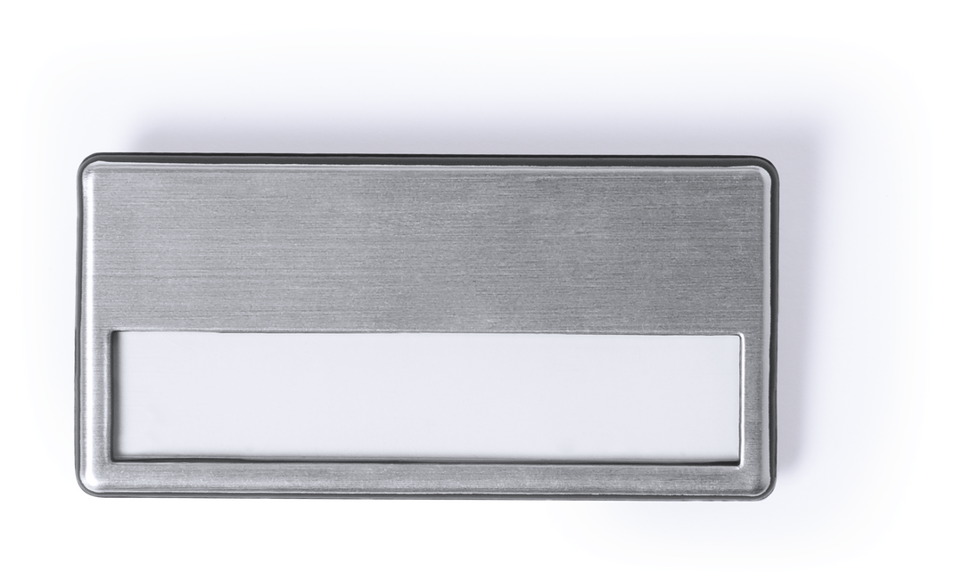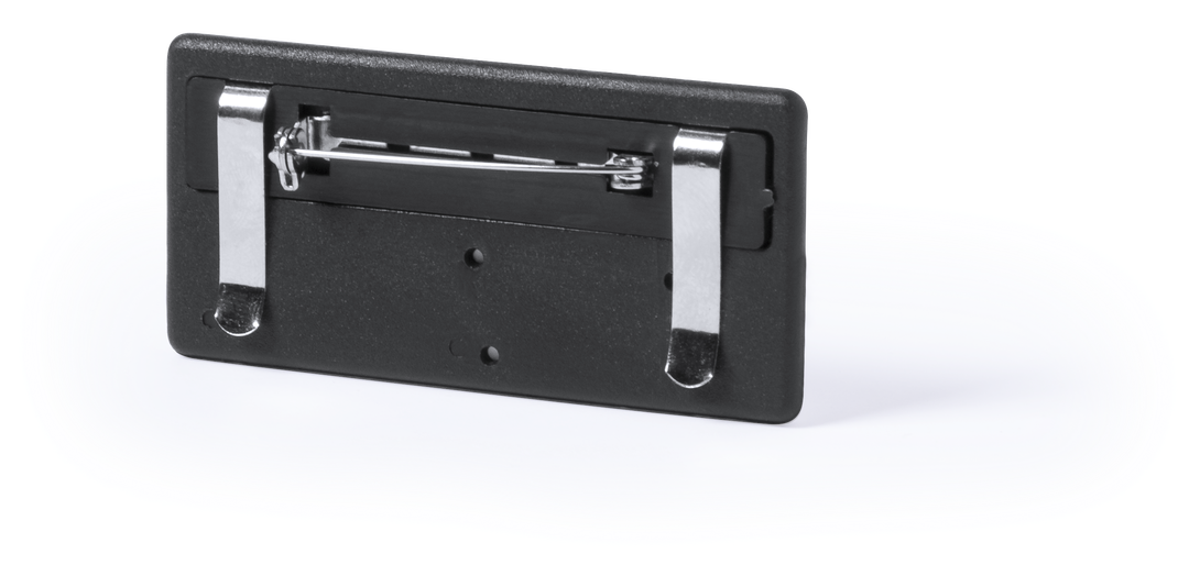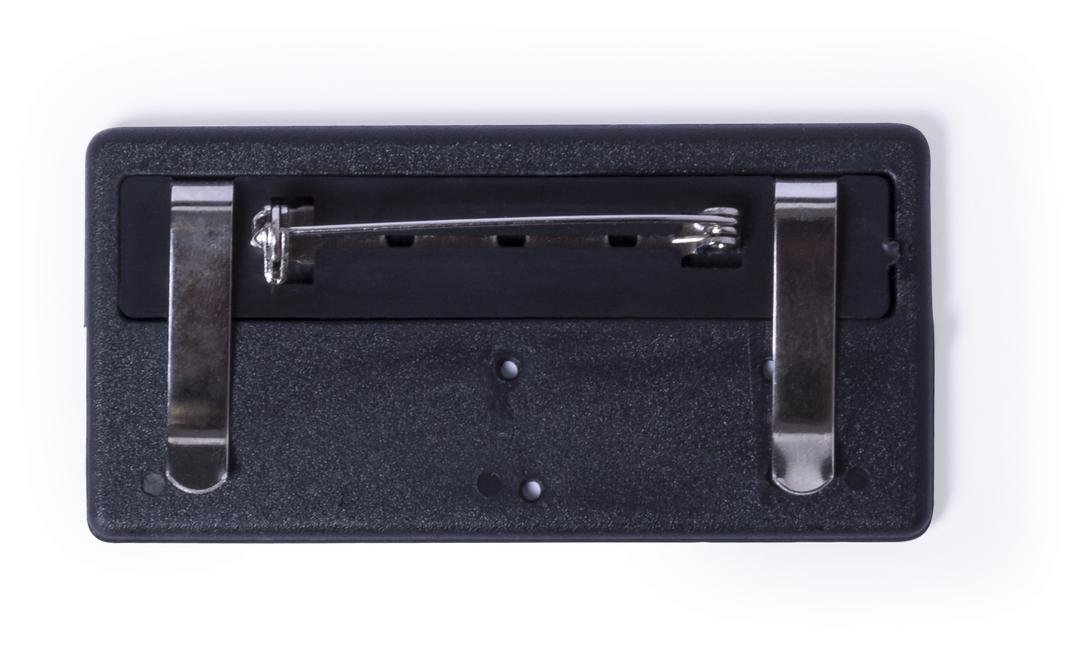 Identificador en acabado brillante. Parte trasera con doble sistema de fijación -pinzas de enganche metálicas e imperdible- para un ajuste seguro.