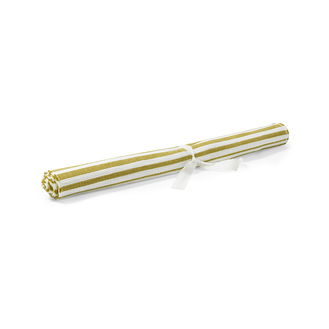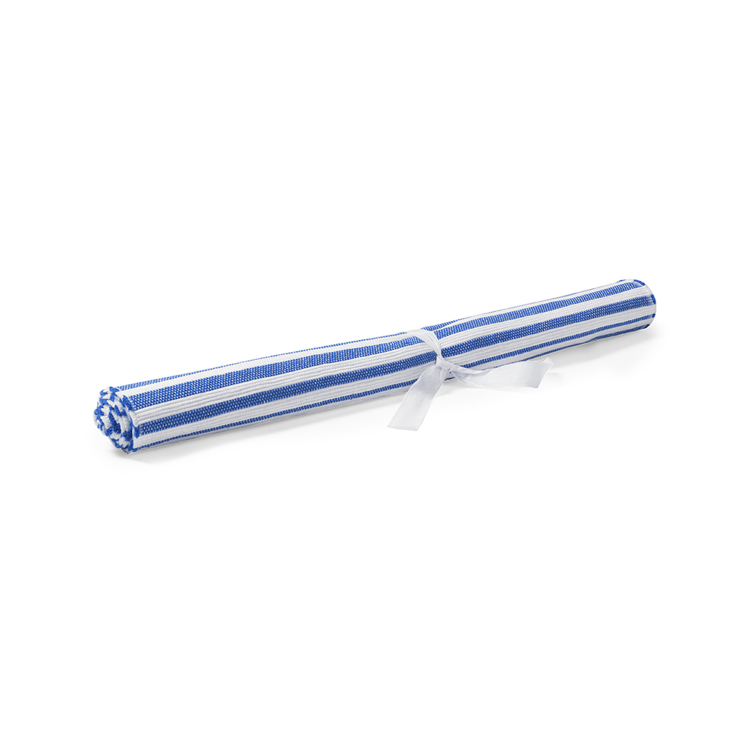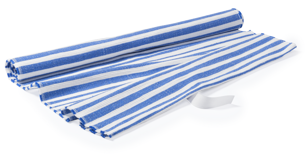 Resistente esterilla de poliéster de 180x70cm en original diseño bicolor a rayas. Con cinta para enrollado.