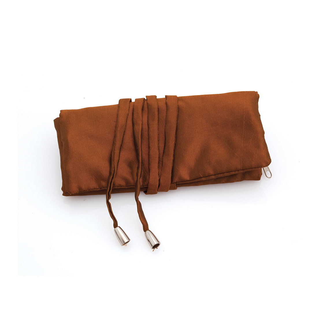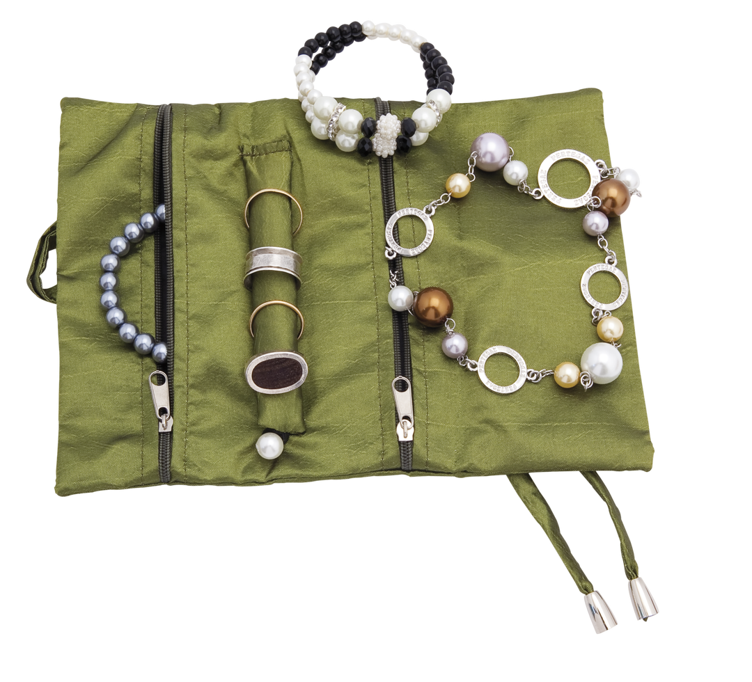 Joyero plegable en suave poliéster de sobrios colores. Con soporte para anillos y dos bolsillos de cremallera a juego. Cierre con cintas rematado con accesorios en color plateado.