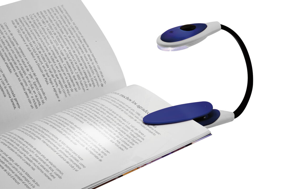 Lámpara led de lectura de diseño bicolor. Con cuerpo flexible y cómoda pinza de sujeción. Presentada en caja individual. 1 Led. Flexible. Pilas Botón Incluidas