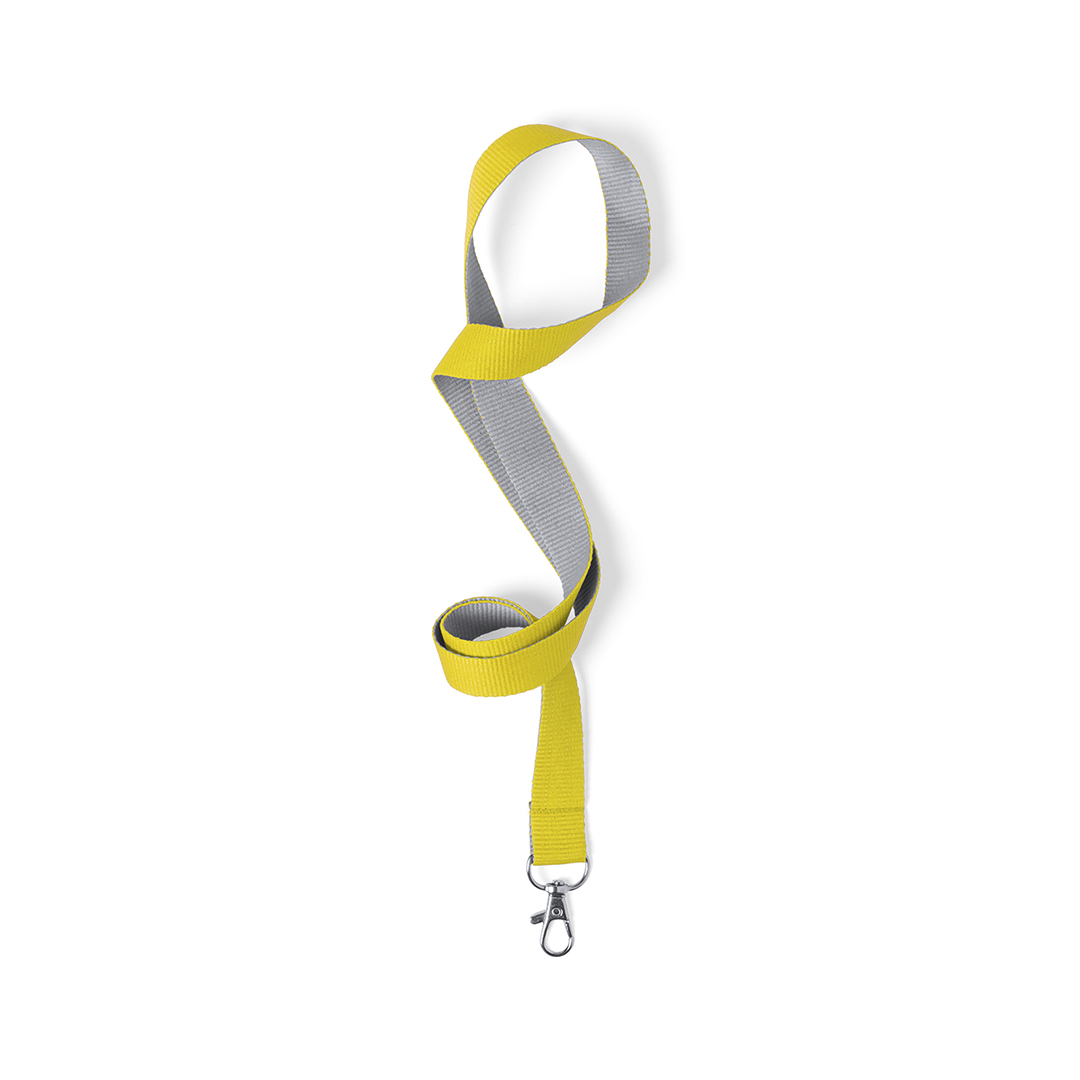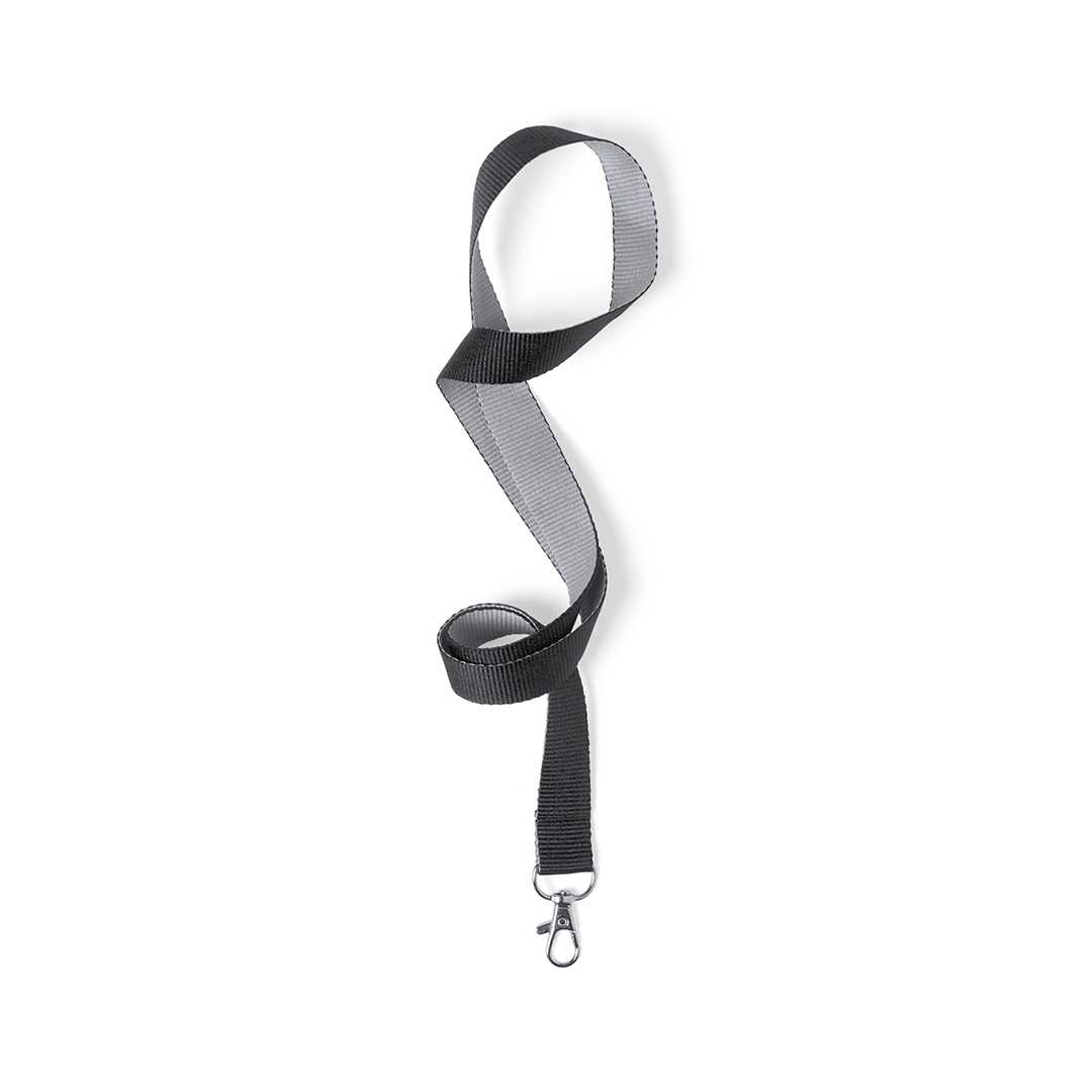Original lanyard en resistente poliéster de diseño bicolor en vivos colores con cierre de mosquetón metálico.