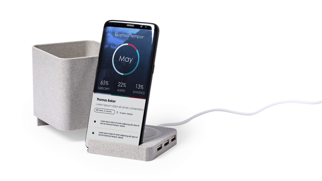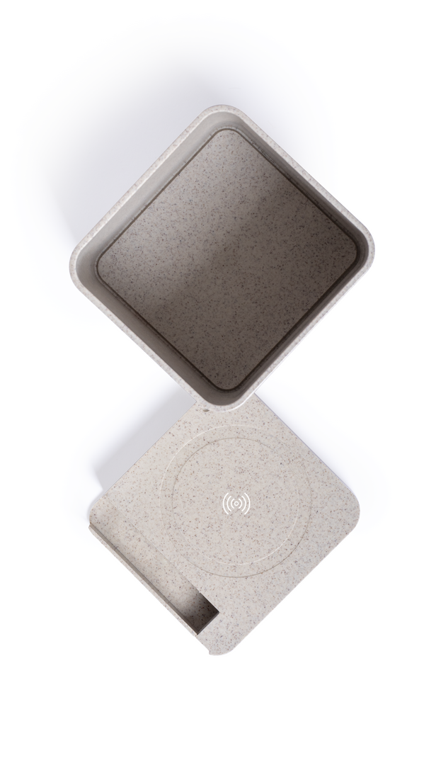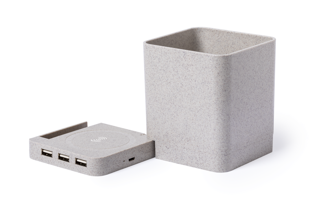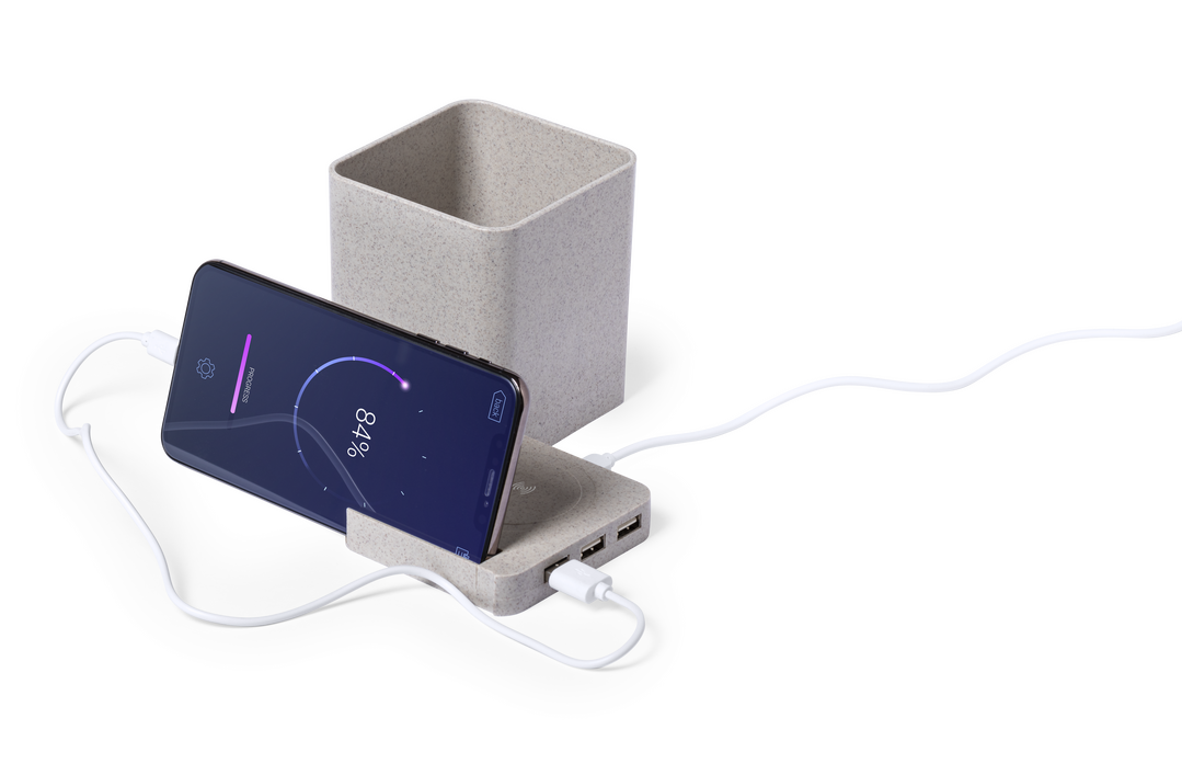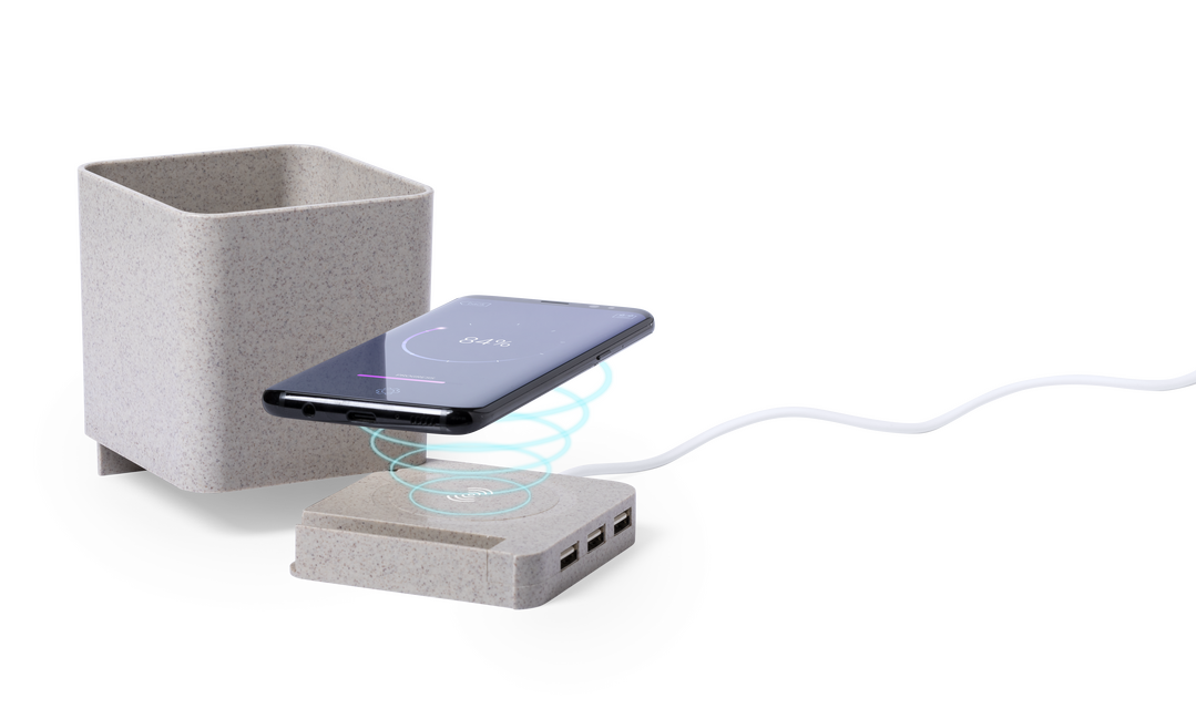 Lapicero multifunción 4 en 1 de línea nature. Carcasa en caña de trigo, para así fomentar la utilización de materias primas naturales y reducir las emisiones contaminantes. Con funciones lapicero, soporte para smartphone, cargador inalámbrico y puerto US Inalámbrico. 3 Puertos. USB 2.0. Cable Incluido