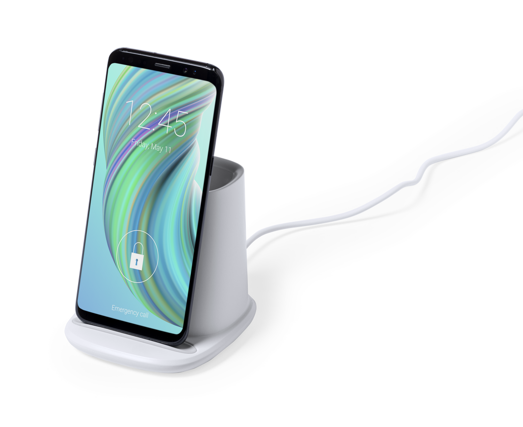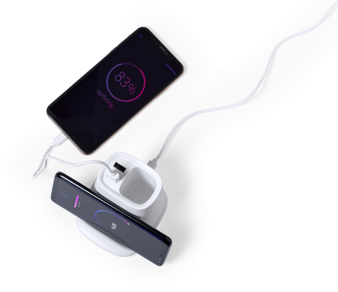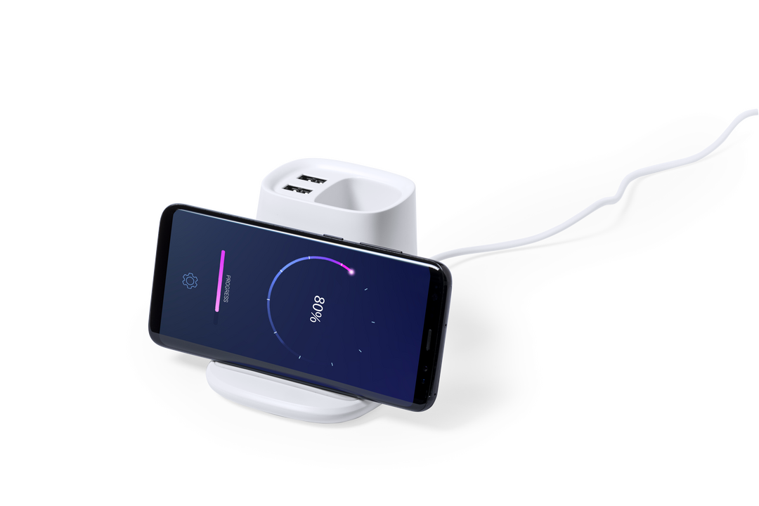Lapicero multifunción 4 en 1, fabricado en resistente material ABS de color blanco. Con funciones lapicero, soporte para smartphone, cargador inalámbrico 5W y 2 salidas USB de 2.000 mA. Puerto USB inferior, apto para transferencia de datos. Compatible con Inalámbrico. 2 Salidas USB 2000 mA. 1 Puerto USB 2.0. Cable Incluido