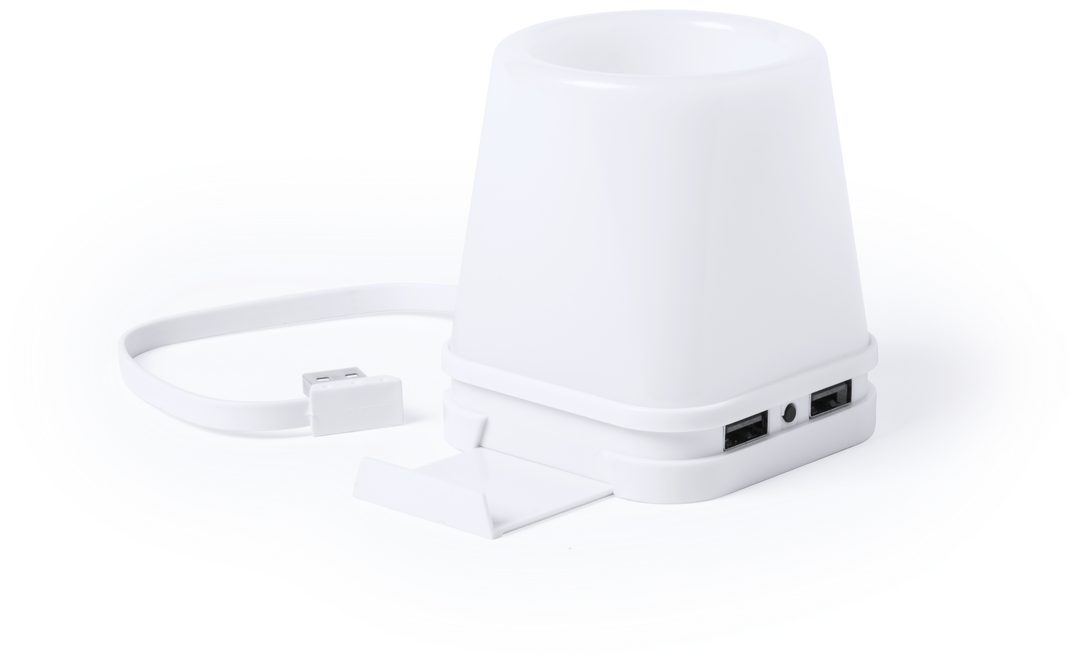 Original lapicero con puerto USB integrado. Retroiluminado por luz led, con 2 posiciones de iluminación y cuerpo en elegante color blanco para fácil marcaje. Incluye 4 puertos USB 2.0. Presentado en caja individual. 4 Ledes. 2 Posiciones de Luz. 4 Puertos. USB 2.0