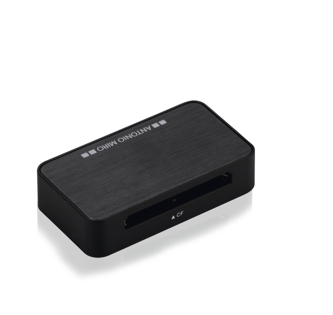 Lector de tarjetas de Antonio Miró con parte superior acabada en aluminio de elegante color negro. Compatible con tarjetas MS, M2, TF, XD, SD y CF. Presentado en caja individual con logotipo de la marca e interior troquelado en suave espuma. Tarjetas: MS, M2, TF, XD, SD, CF