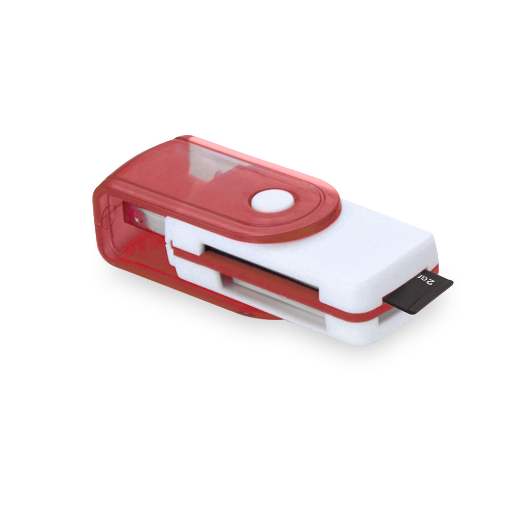 RojoOriginal lector de tarjetas de apertura giratoria, con conexión USB 2.0 y en divertidos diseños bicolor. Compatible con tarjetas M2, MS Duo, micro SD y SD. Presentado en caja individual. Tarjetas: M2, MS Duo, MicroSD, SD