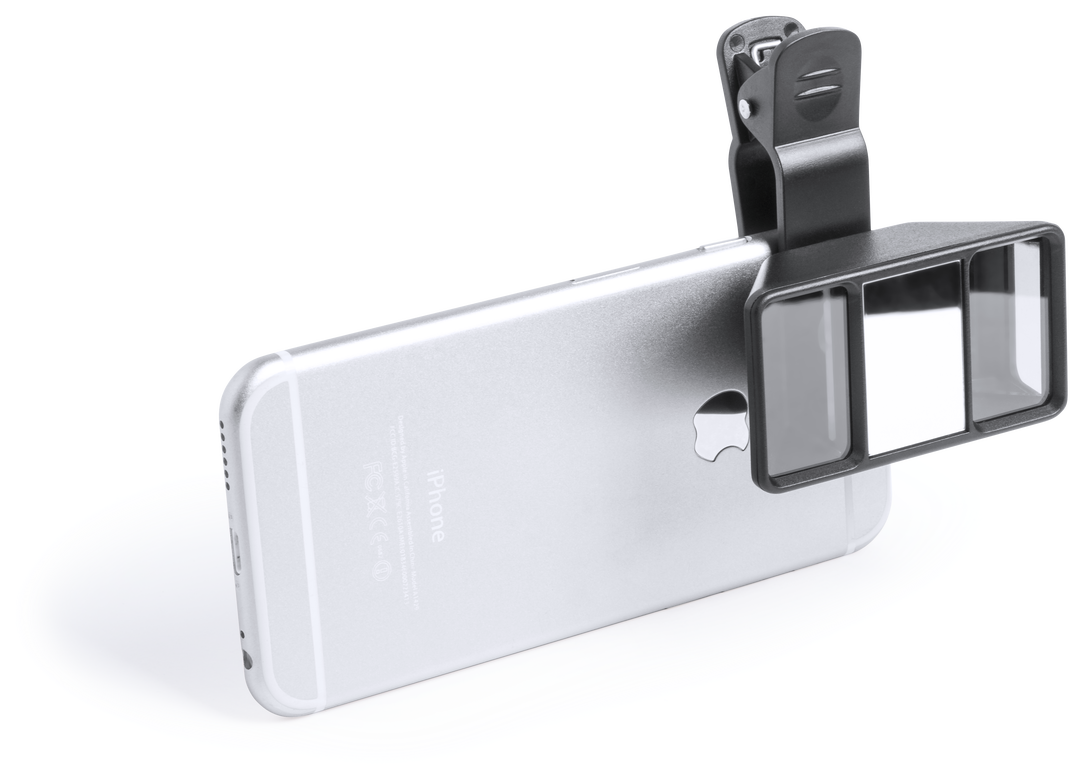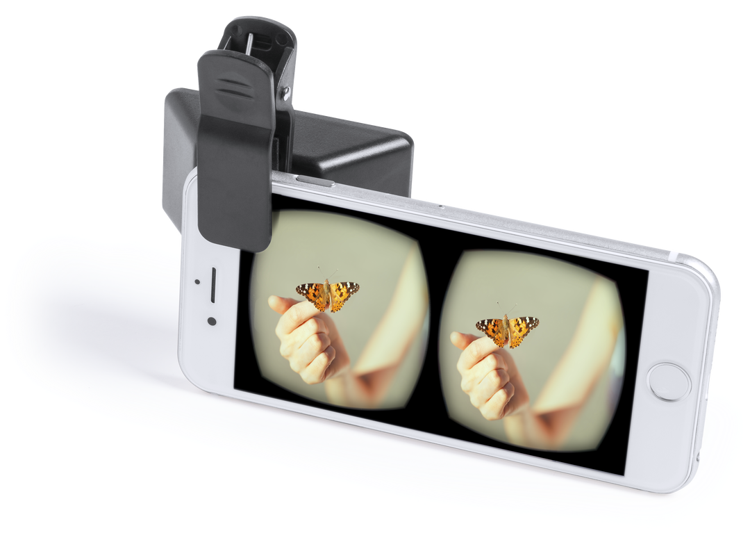 Lente para cámara de smartphone con tecnología 3D que permite grabar vídeos y tomar fotos en formato 3D para posterior visionado en gafas de realidad virtual. Con pinza de sujeción de seguridad.