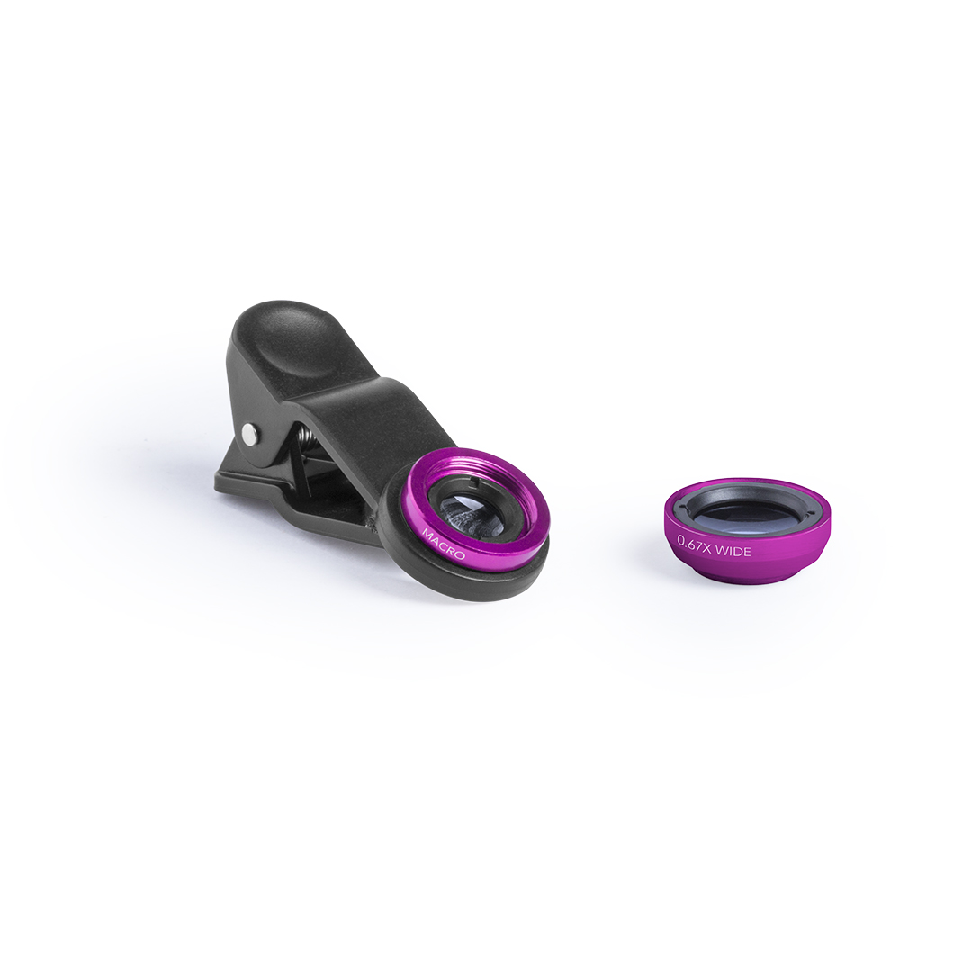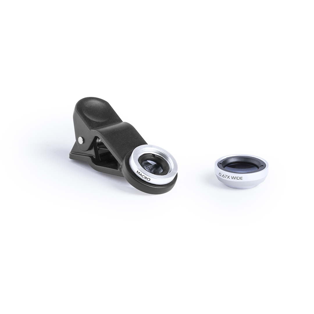 Set de lentes universales para smartphone, ajustables a la cámara mediante pinza. Lentes de aluminio y cristal, con efectos -macro- y -gran angular-, con paño limpiador de microfibra y presentadas en una bolsita de terciopelo con cordones autocierre. Set 2 Lentes Cristal/ Aluminio