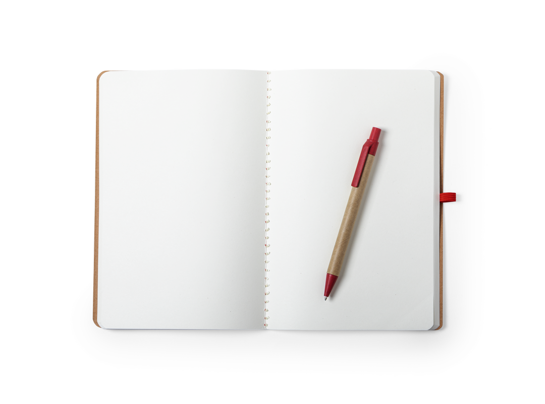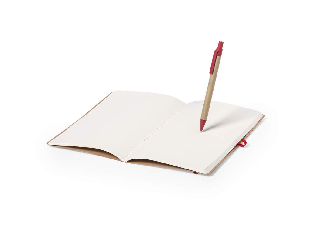 Set de libreta y bolígrafo de línea nature. Incluye libreta en cartón reciclado, con soporte para bolígrafo y cinta de cierre a juego, de 60 hojas lisas. Bolígrafo de mecanismo pulsador, con cuerpo en cartón reciclado y accesorios en caña de trigo -tinta 60 Hojas. Bolígrafo Cartón Reciclado/ Caña de Trigo/ ABS Incluido