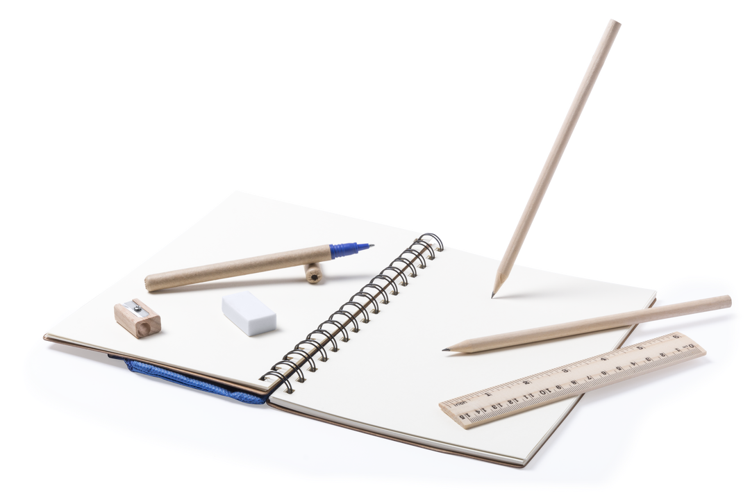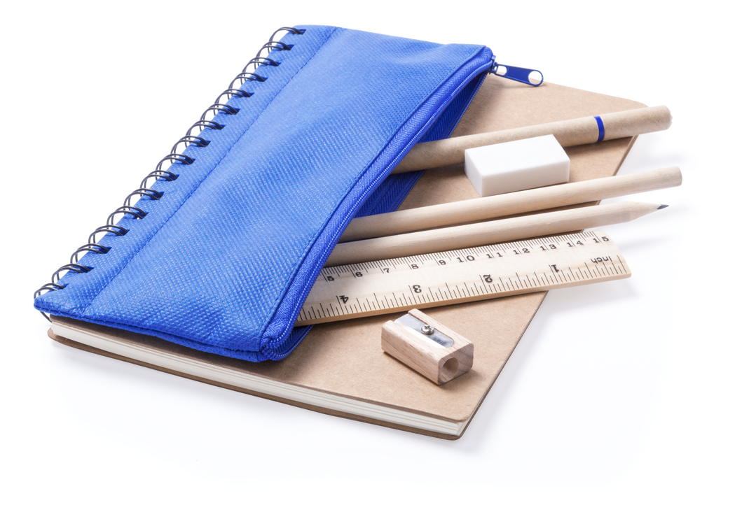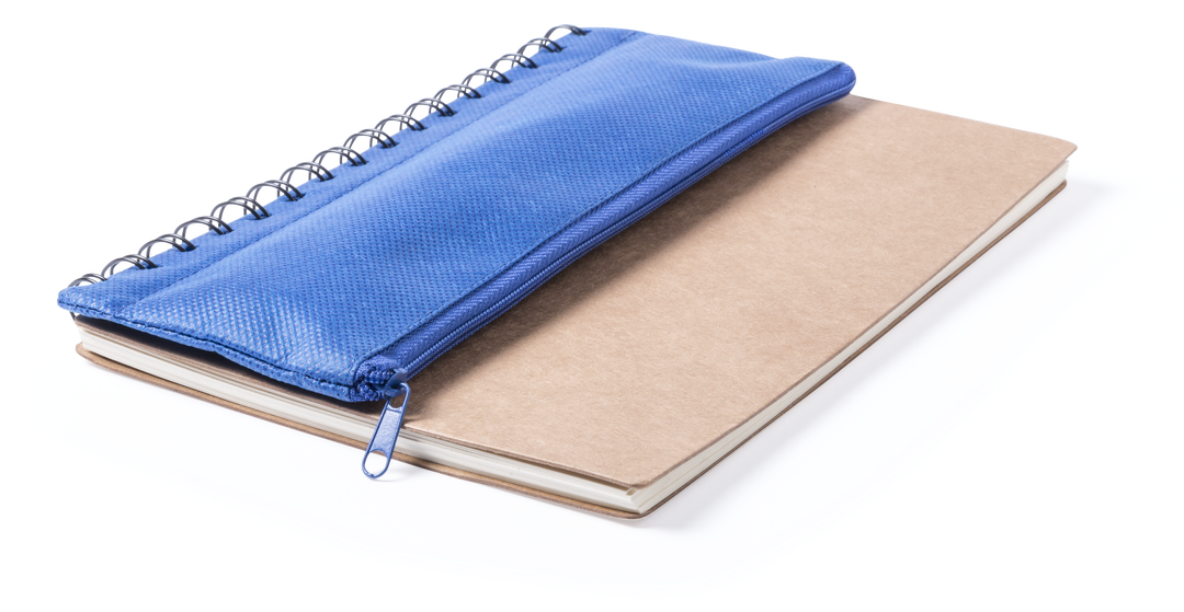 Libreta de anillas con tapas de suave tacto acabadas en resistente cartón reciclado. Con estuche en poliéster 600D de vivos colores y cierre de cremallera integrado en portada. Incluye bolígrafo en cartón reciclado y set de regla, lápices y sacapuntas en Portada Rígida. 70 Hojas. Estuche Incluido. 6 Piezas