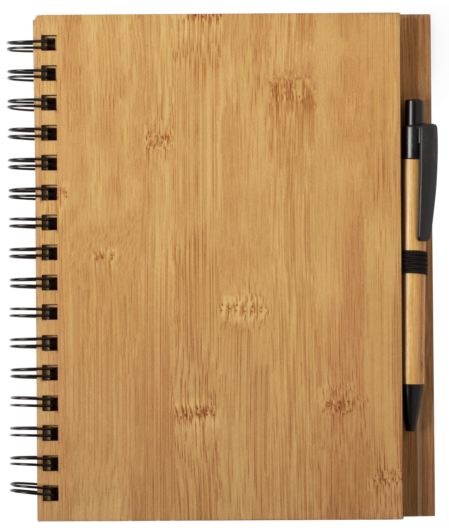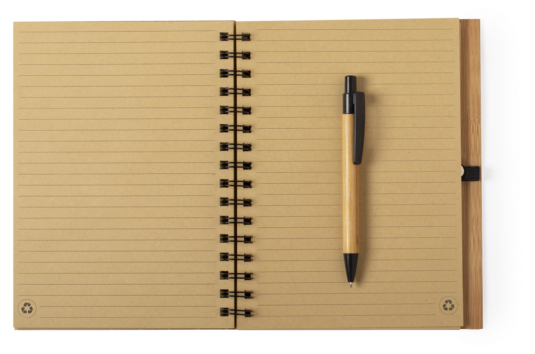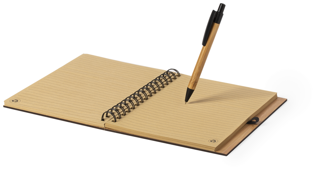 Set de libreta y bolígrafo de línea nature. Libreta de anillas con tapas rígidas en bambú, con soporte para el bolígrafo. De 80 hojas con diseño eco y disposición a una raya. Bolígrafo de mecanismo pulsador, con cuerpo de bambú y tinta negra. Portada Rígida. 80 Hojas. Bolígrafo Bambú Incluido. Tinta Negra