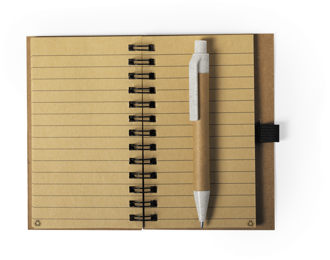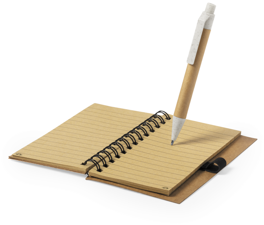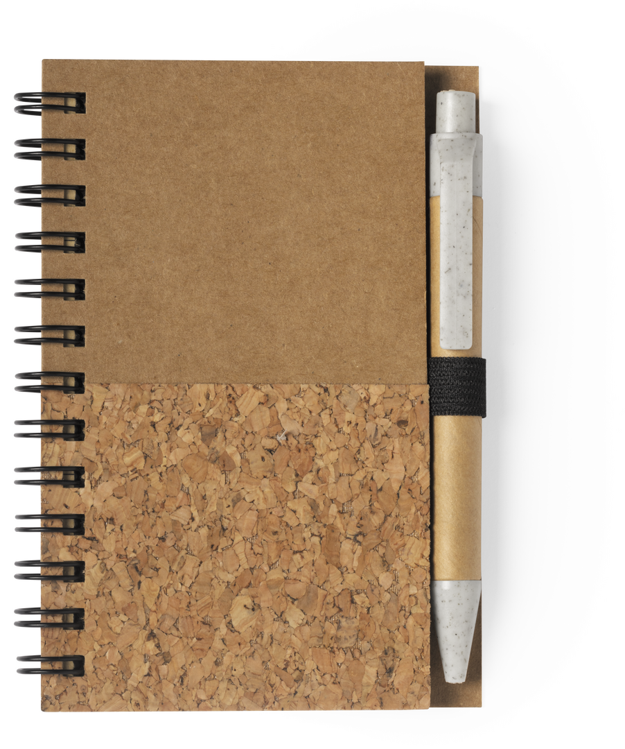 Set de libreta y bolígrafo en línea nature. Incluye libreta de anillas con tapas rígidas en corcho natural y cartón reciclado, con 80 hojas de disposición a una raya y diseño eco. Bolígrafo de mecanismo pulsador, con cuerpo en cartón reciclado y accesorio Portada Rígida. 50 Hojas. Bolígrafo Cartón Reciclado/ Caña de Trigo/ ABS Incluido