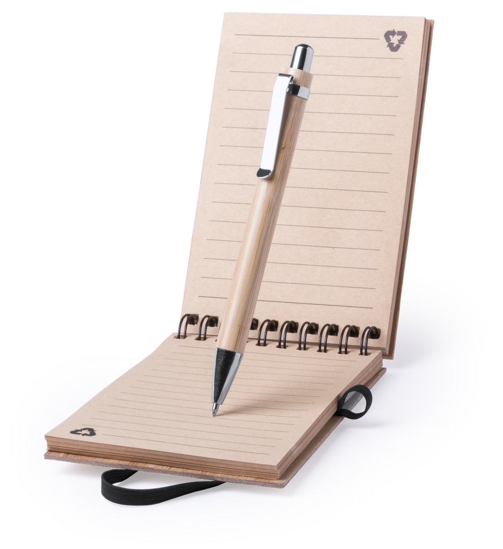 Libreta de anillas en línea nature con tapas rígidas de bambú y bolígrafo a juego, también en bambú. De tamaño compacto, con elástico de cierre en elegante color negro. Incluye 70 hojas con disposición a una raya y diseño eco. Bolígrafo con cartucho jumbo Portada Rígida. 70 Hojas. Bolígrafo Bambú Incluido. Carga Jumbo