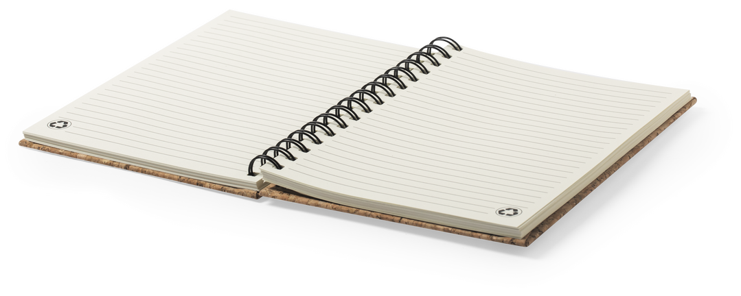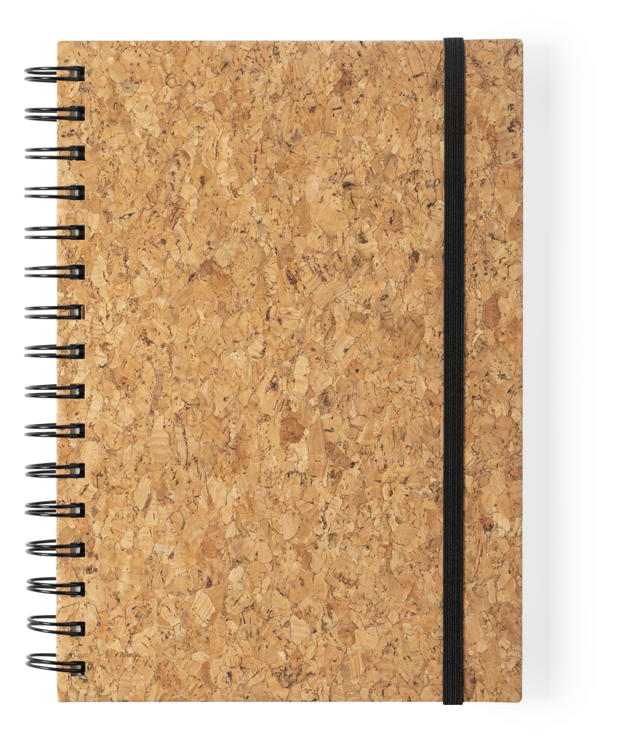 Libreta de anillas en línea nature. Con tapas rígidas en corcho natural y elástico de cierre en color negro. De 100 hojas con diseño eco y disposición a una raya. Portada Rígida. 100 Hojas