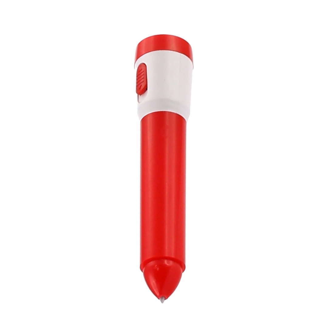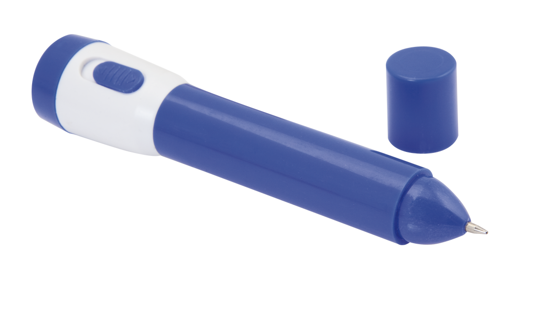 Bolígrafo de capucha con linterna led integrada en originales colores. En tinta azul y con pilas de botón incluidas. 1 Led. Pilas Botón Incluidas