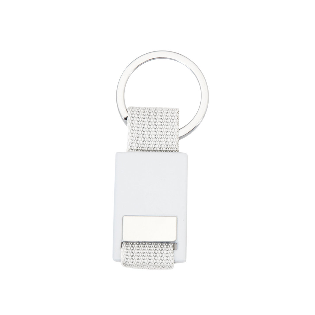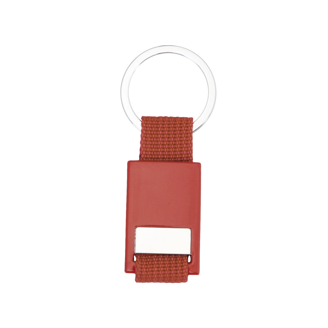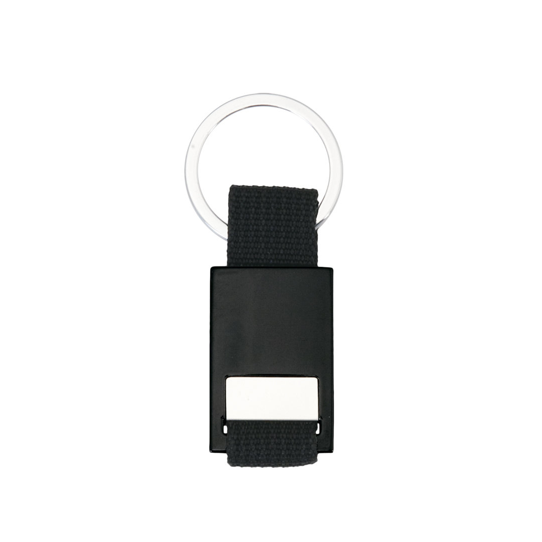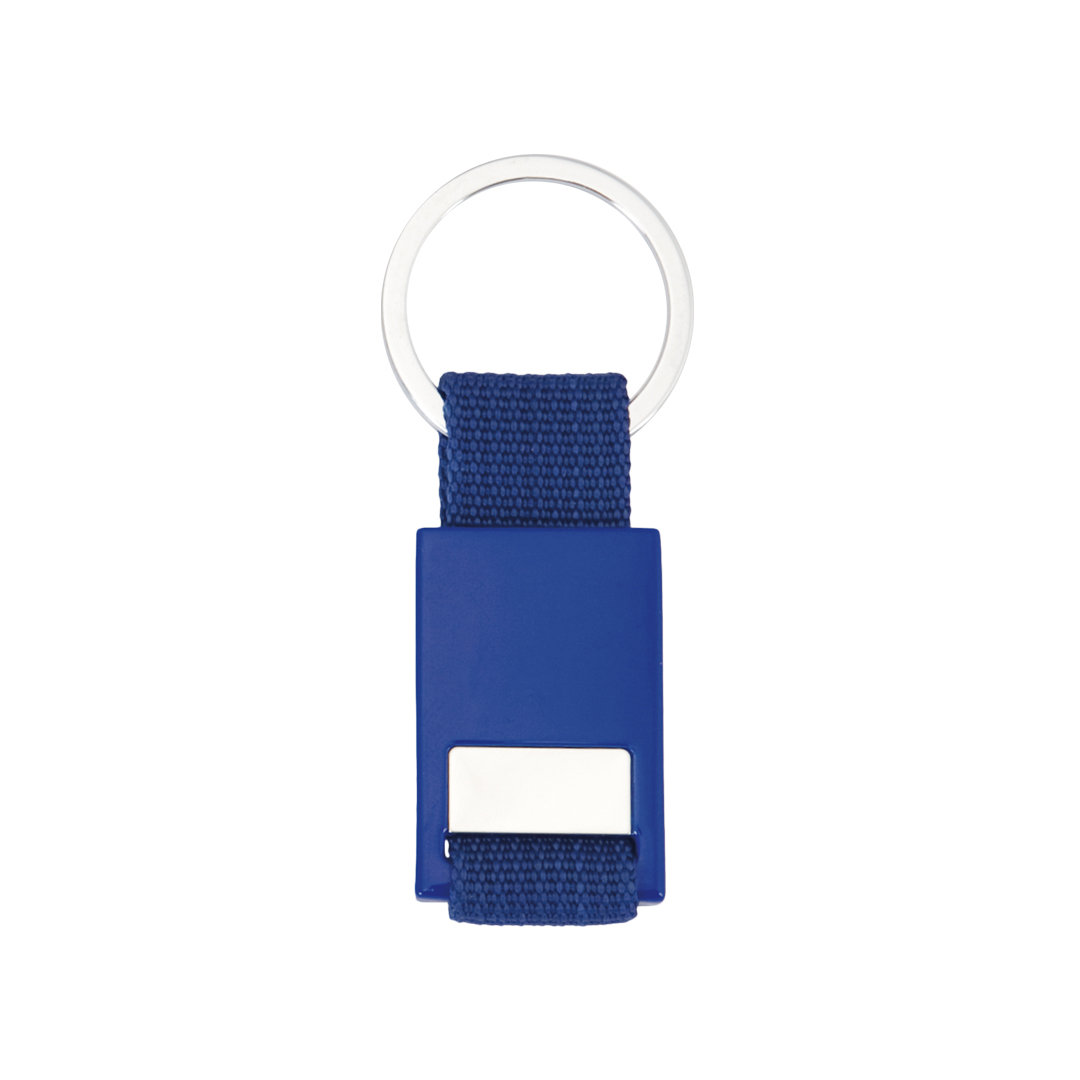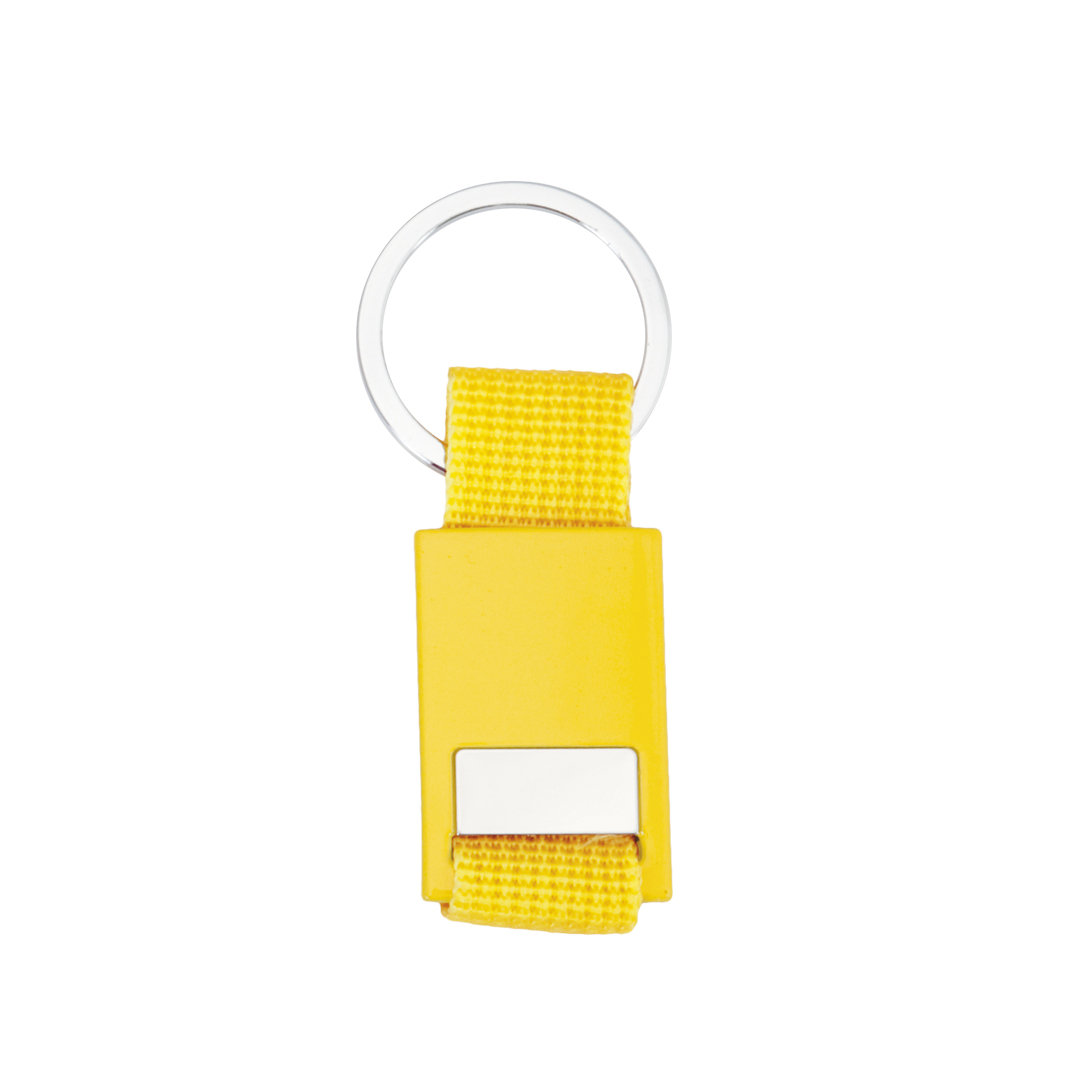 Llavero de divertido diseño con cinta de poliéster de variados y vivos colores. Con cuerpo metálico a juego especialmente diseñado para marcaje en láser.