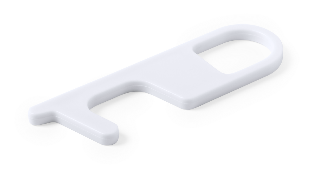 Llavero higiénico antibacteriano y anti-contacto, fabricado en resistente ABS de acabado sólido. Especialmente diseñado para evitar tocar con las manos superficies de uso común (manivelas de puertas, interruptores, grifos de uso público, cajeros automátic