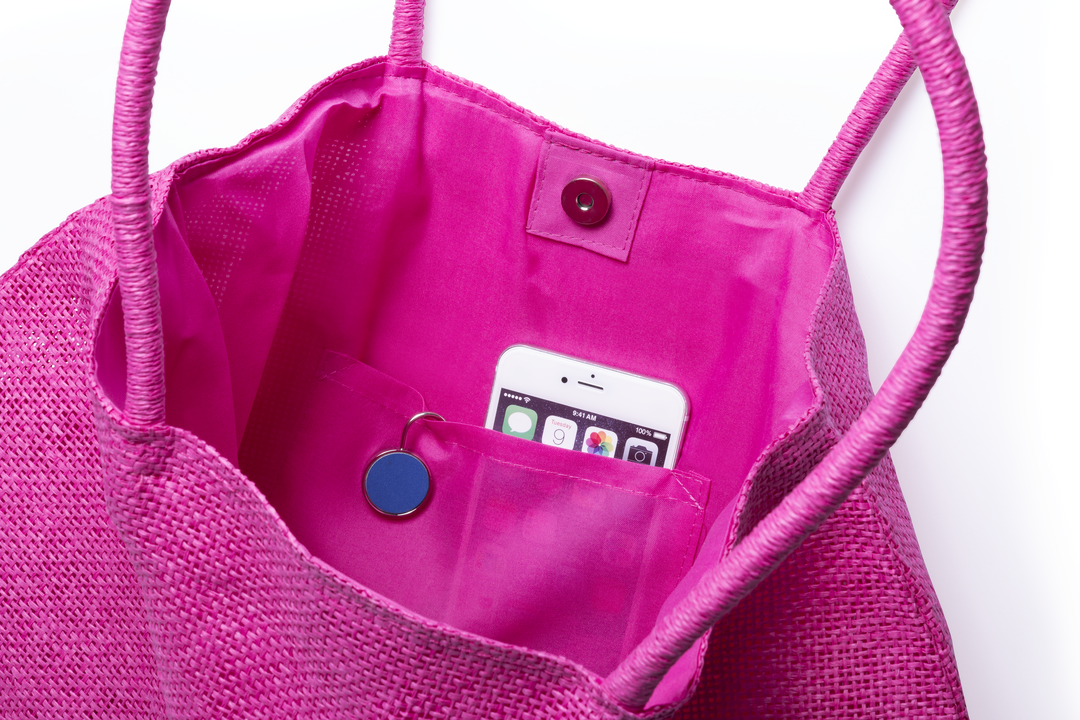 Llavero cuelgabolsos metálico con corona en polipiel de vivos colores. Con cinta de transporte de cierre de mosquetón. Presentado en estuche individual.