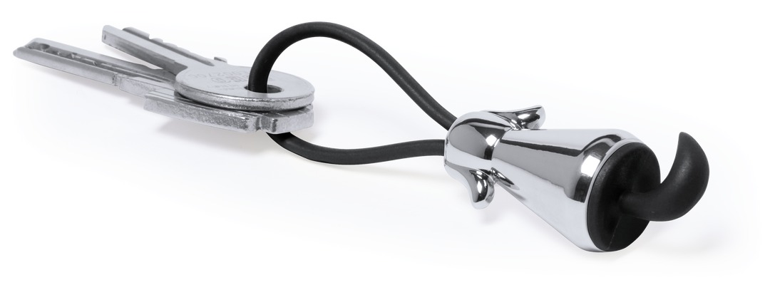 Llavero metálico de acabado brillante en original diseño minimalista de perro. Con cinta en resistente silicona de color negro.