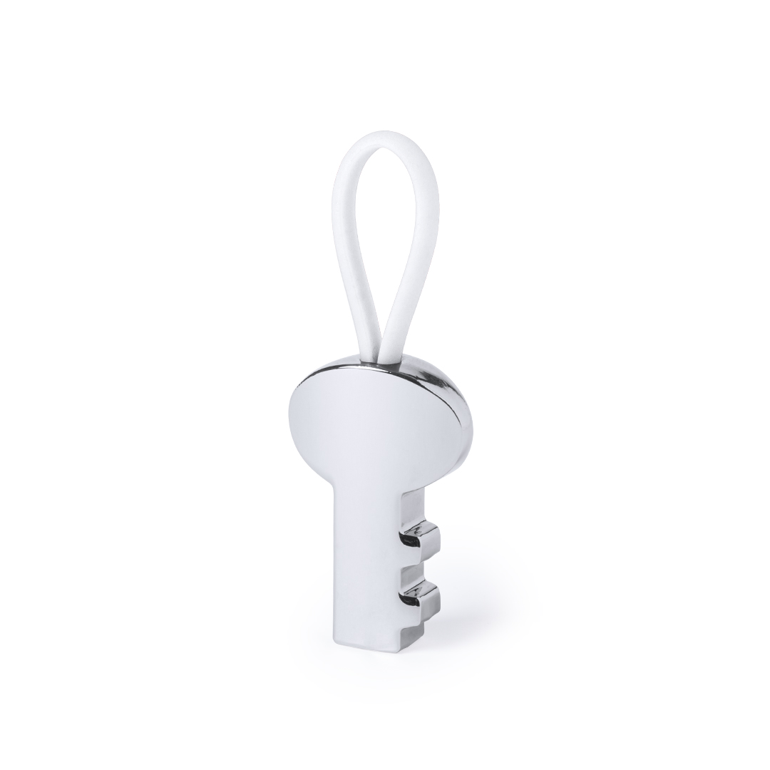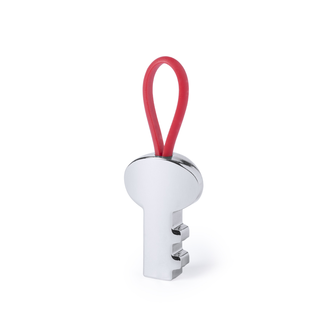 Original llavero en forma de llave de acabado metálico brillante. Con cinta de resistente silicona en variada gama de colores y presentado en bolsita individual con auto cierre.