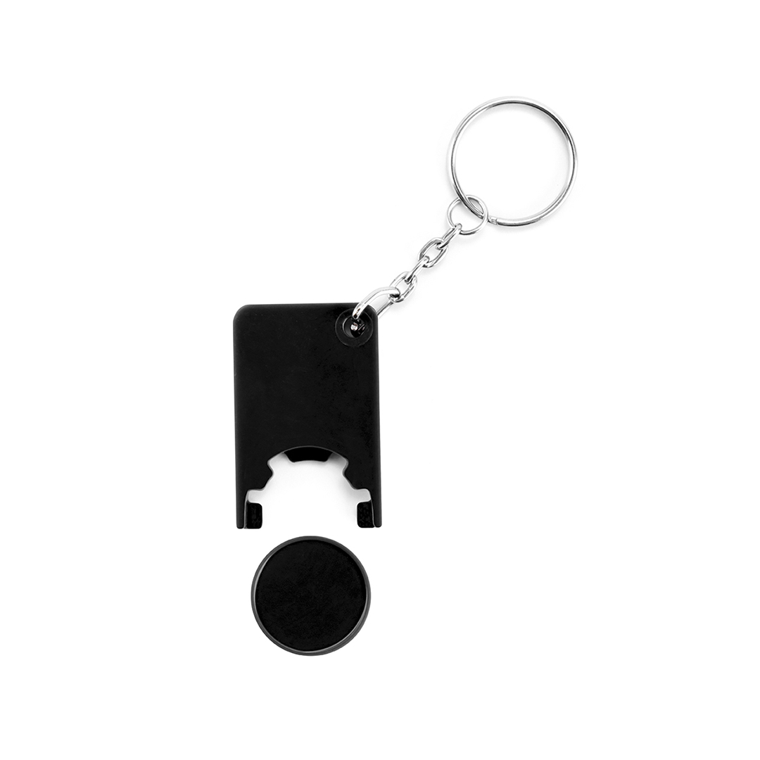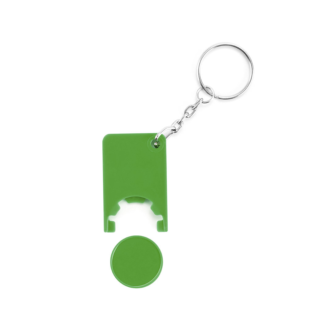 Llavero moneda en divertido diseño de variados colores y con moneda extraíble.