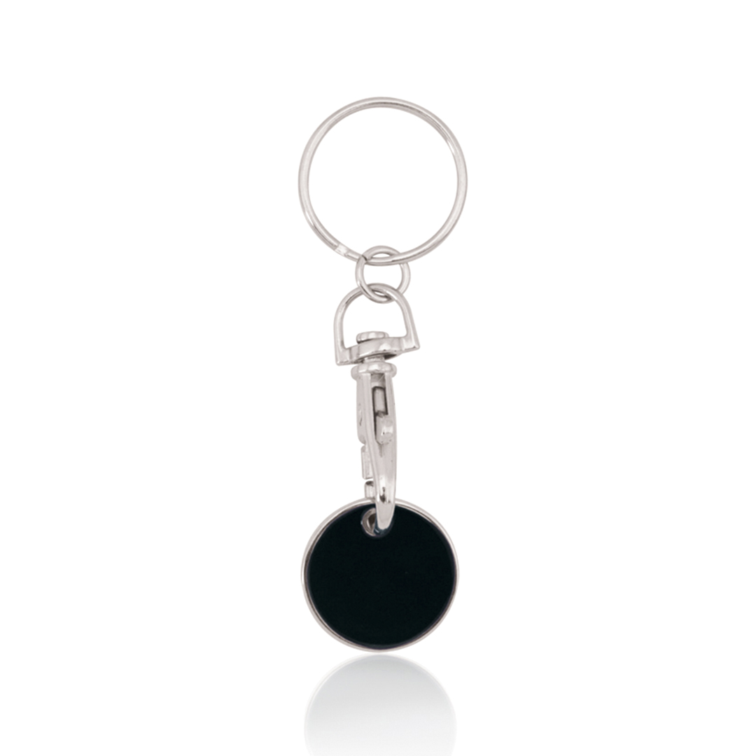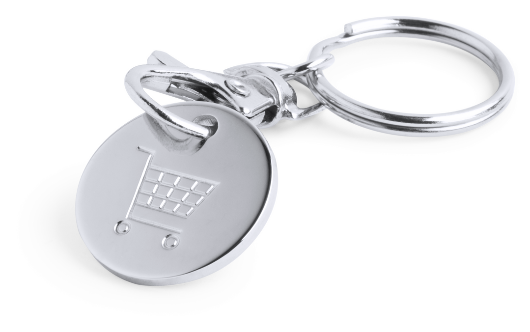 Llavero moneda metálico en divertido diseño de variados colores con moneda extraíble y cierre de mosquetón.