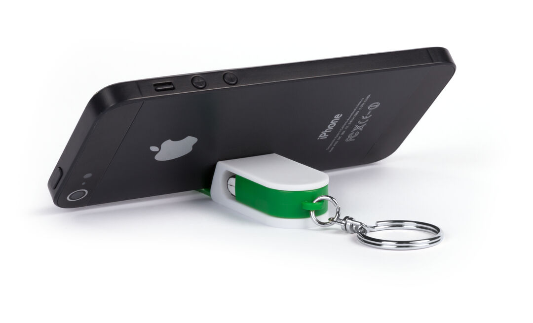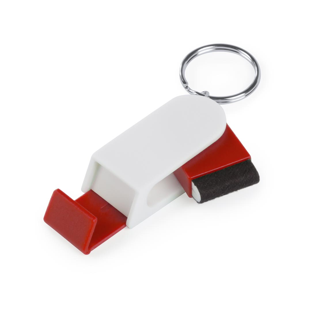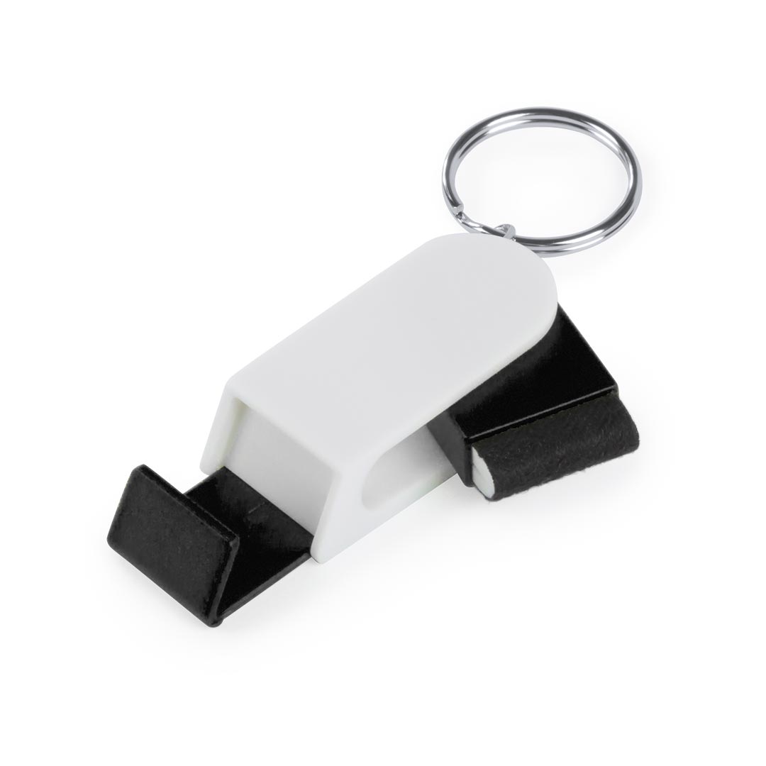 Original llavero soporte para smartphone en elegante acabado bicolor y con limpiador de pantalla de mecanismo giratorio integrado. Limpiapantallas Incluido