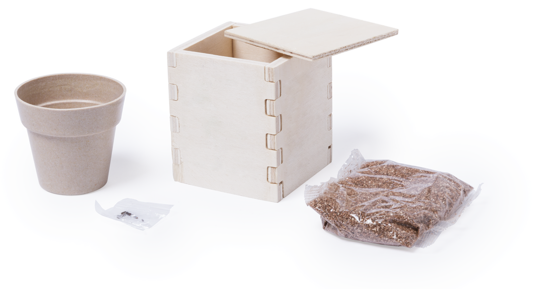 Maceta de menta con macetero de línea nature. Incluye también una original caja de madera para marcaje de logotipo, con 6-8 semillas y sustrato de crecimiento. Presentada en atractiva caja de diseño. Macetero Biodegradable. 6-8 Semillas de Menta Incluidas