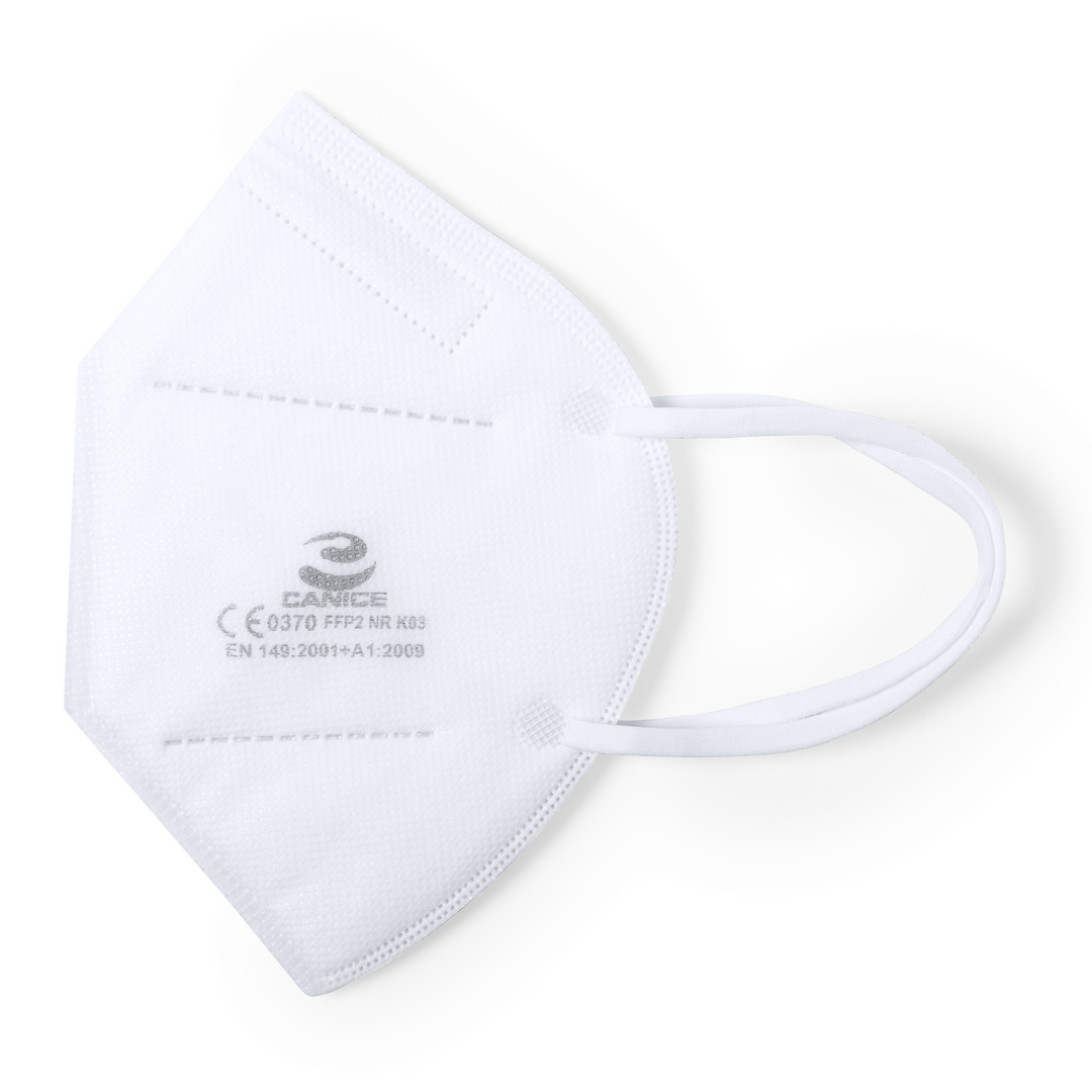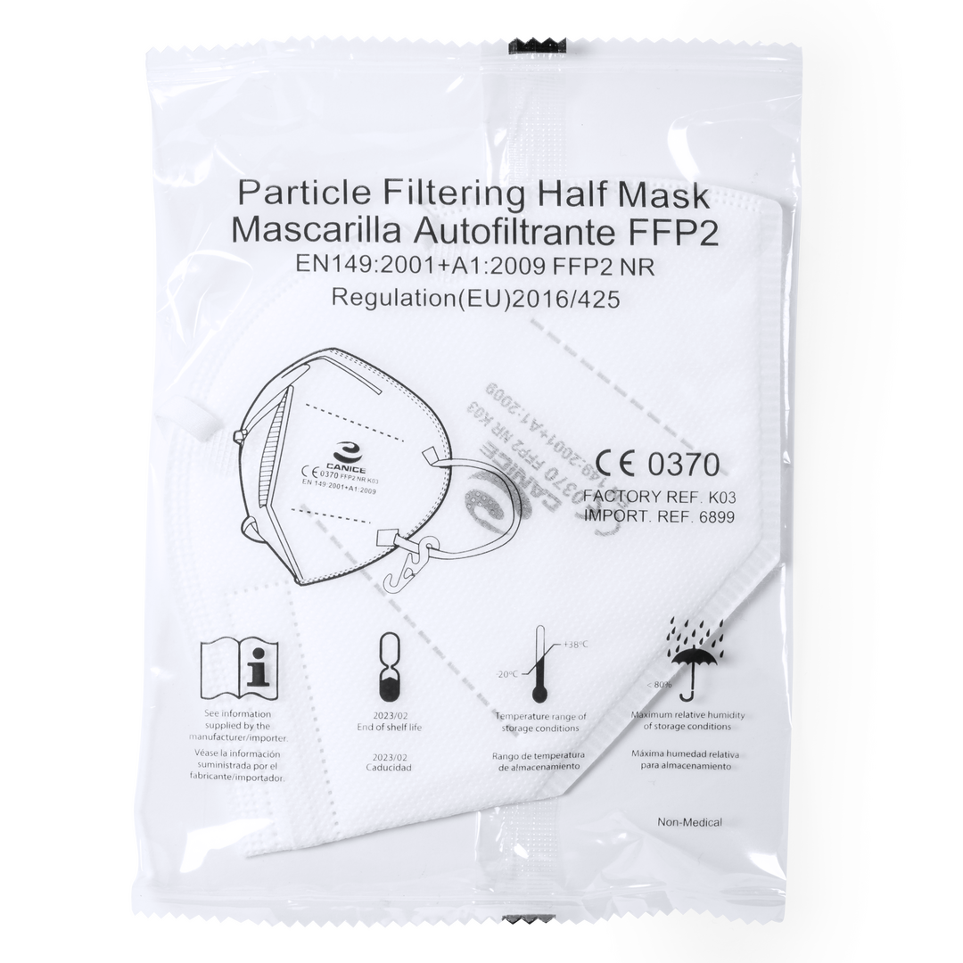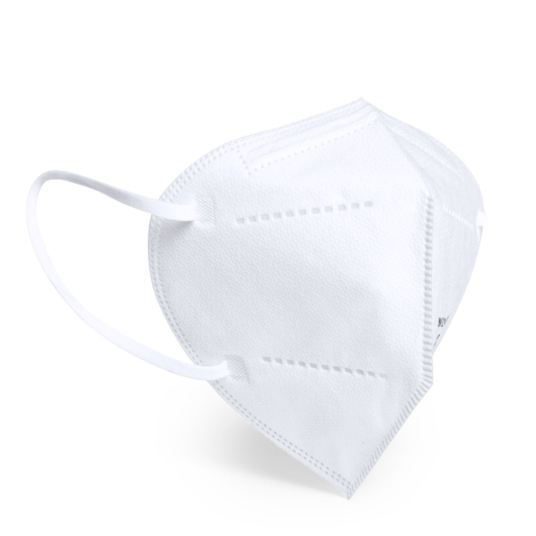 Mascarilla autofiltrante de protección y seguridad FFP2 en color blanco. Con doble protección, tanto para el portador de la mascarilla como para las personas del entorno. Fabricación de 5 capas y acabado termosellado, incluyendo bandas elásticas de fijac