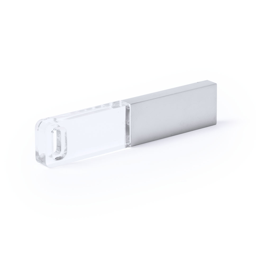 Memoria USB de 16GB de capacidad, con cuerpo en combinación de aluminio y material acrílico transparente que se ilumina con luz blanca al conectarla al puerto USB. Presentada en estuche individual de PVC con interior en troquelado en suave espuma. Luces Led. Presentación Individual