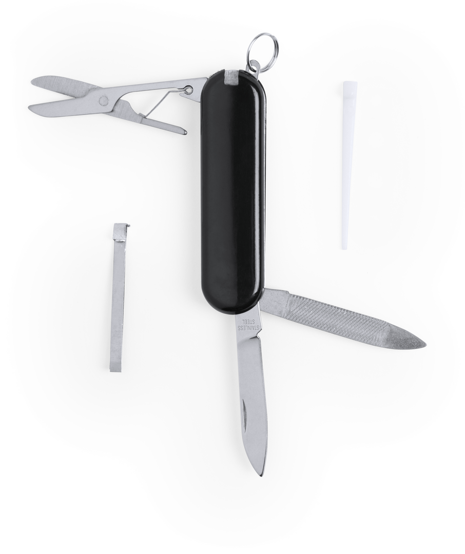Mininavaja multiusos con accesorios de acero inox, de 6 funciones en variados colores. Incluye navajas, pinzas, lima, palillo, anilla para llavero y tijeras. Presentada en caja individual. 6 Funciones
